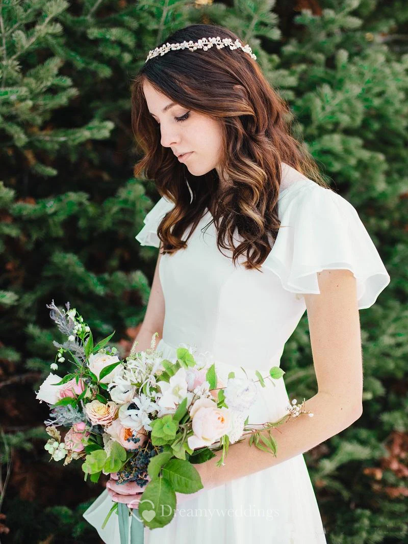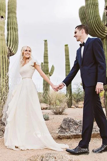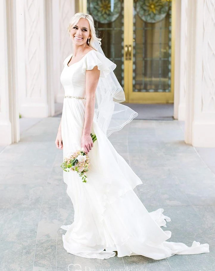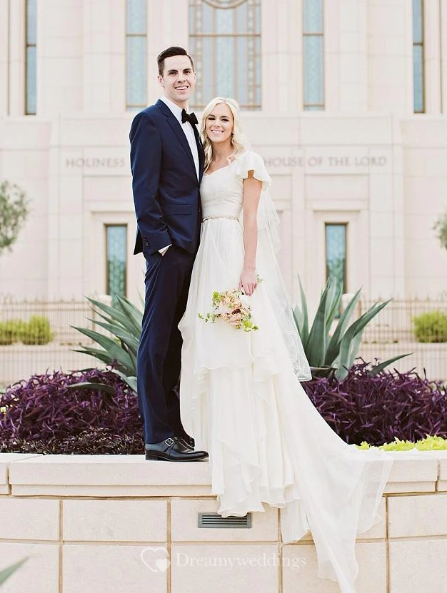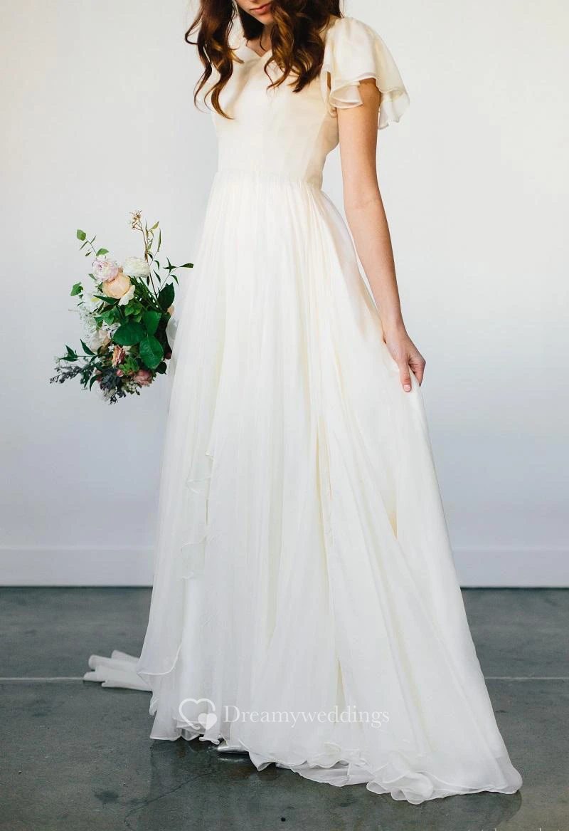 Flowy Beach Short Sleeves Beaded Belt Temple Chiffon Modest Wedding Dress