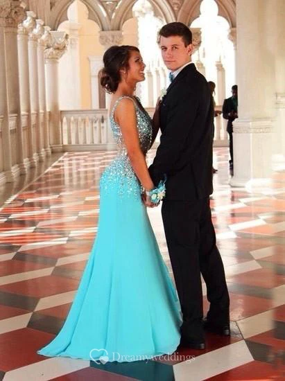 Glamorous Beadings Front Split Prom Dress V-neck Straps Sweep Train