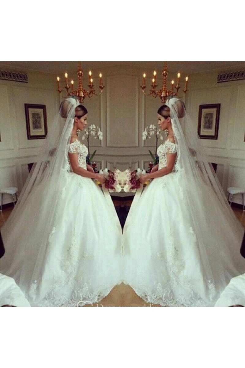 Glamorous Beadings Tulle Ball Gown Wedding Dress Off-the-shoulder Button Back