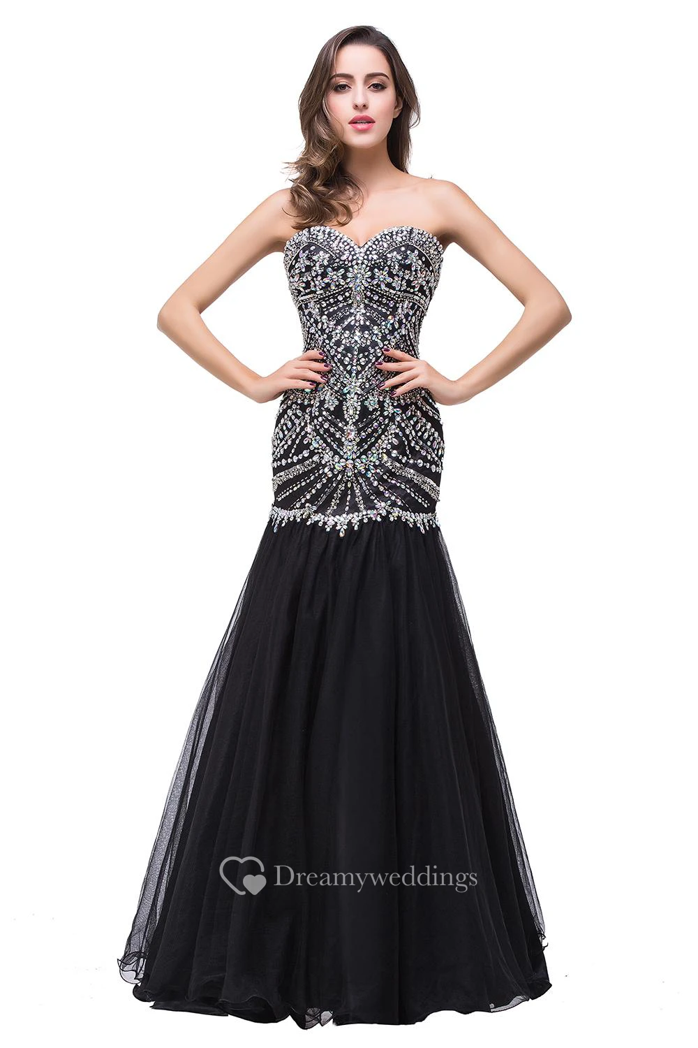 Glamorous Crystals Black Mermaid Prom Dress Sweetheart Sleeveless Zipper