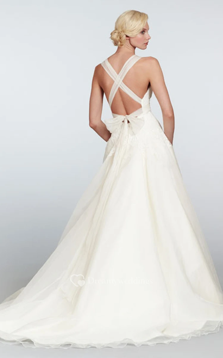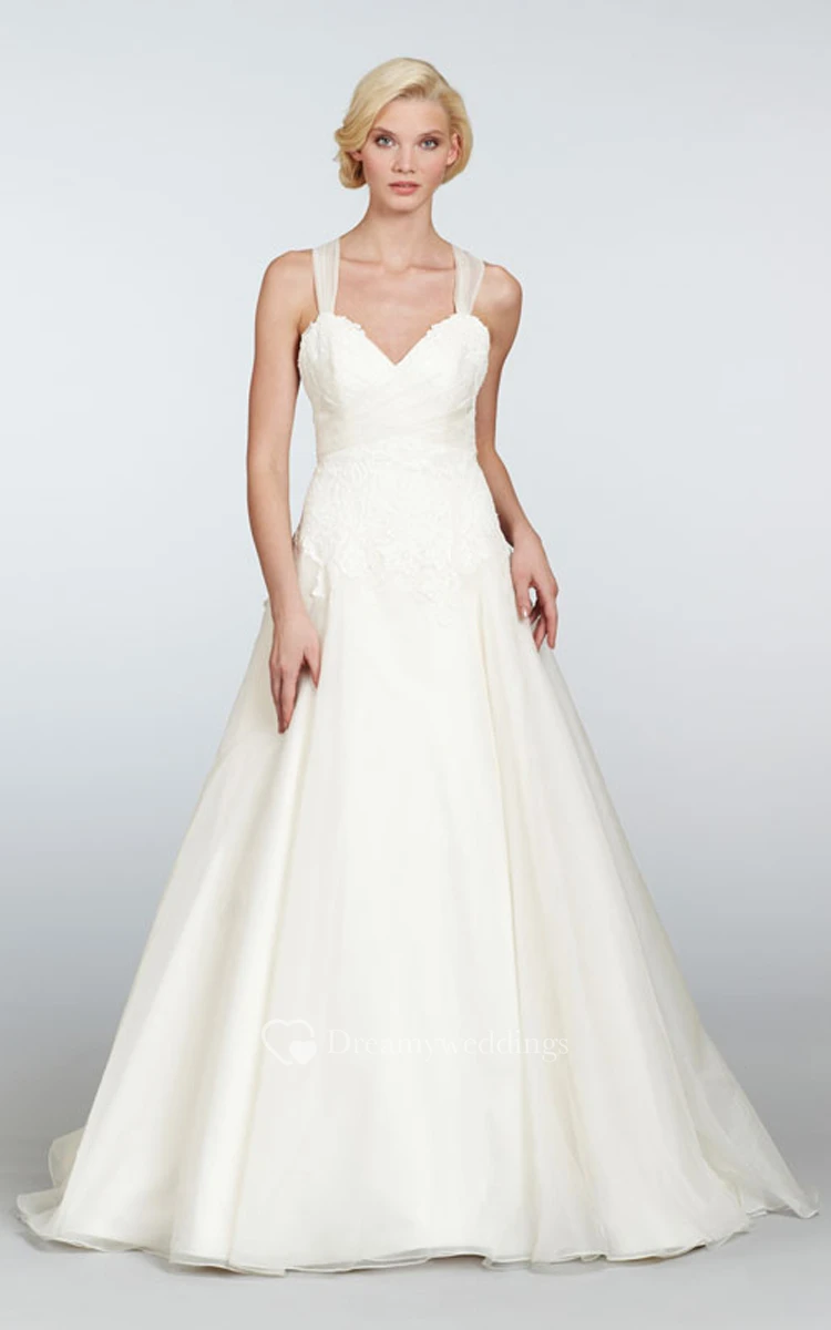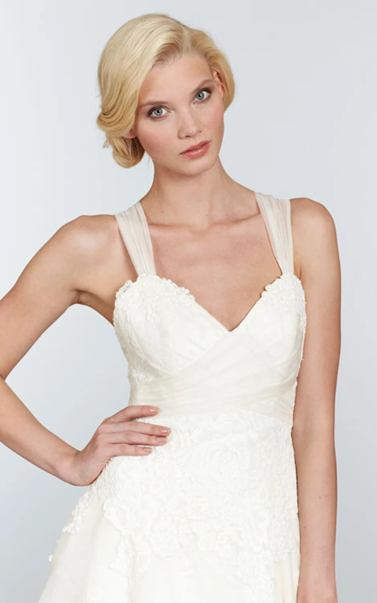 This stupefying wedding gown features a feminine sweetheart neckline on semi-transparent tulle straps crisscrossed on the back and tied in a gentle bow detail. Lace bodice forms an artistic shaped lowered waistline. Fantastic organza A-line skirt gracefully drapes to the feet where it forms a finely hemmed chapel train.