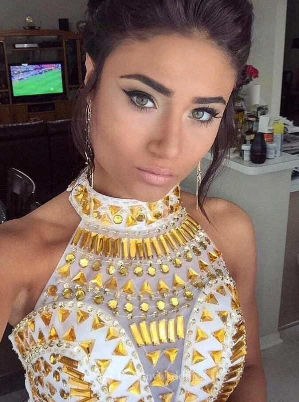 Glamorous Halter Crystals Chiffon Two Pieces Prom Dress Front Split