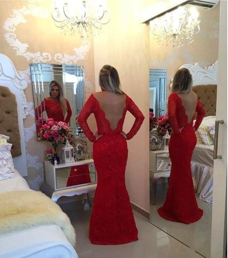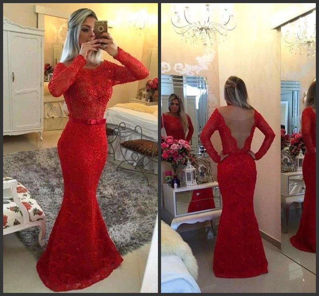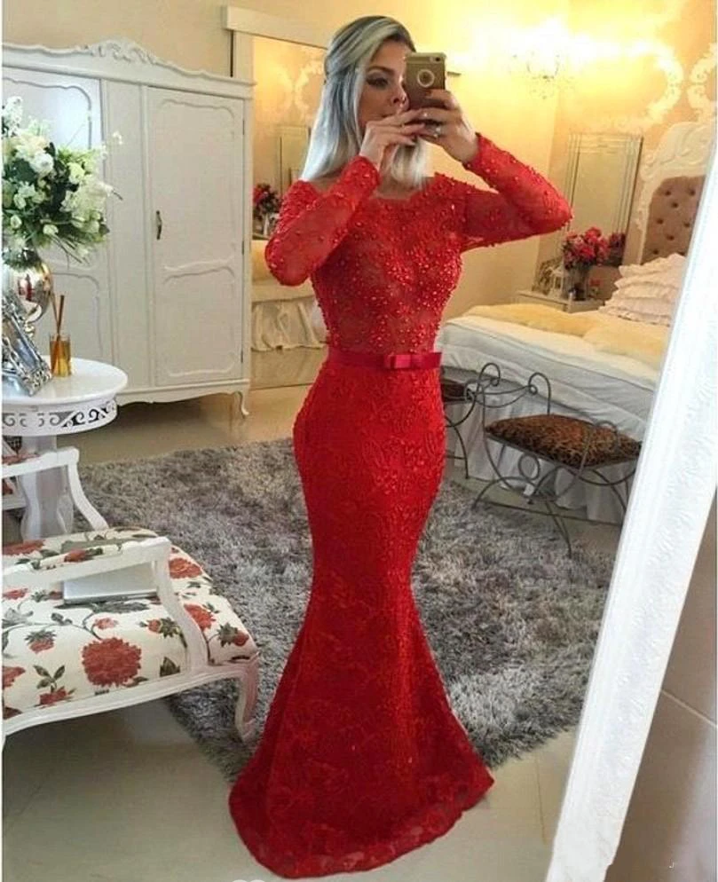 Glamorous Jewel Mermaid Red Pom Dress Long Sleeve With Beadings