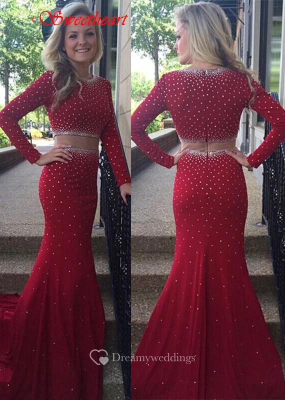 Glamorous Long Sleeve Beadings Prom Dresses Burgundy Long Long Sleeve