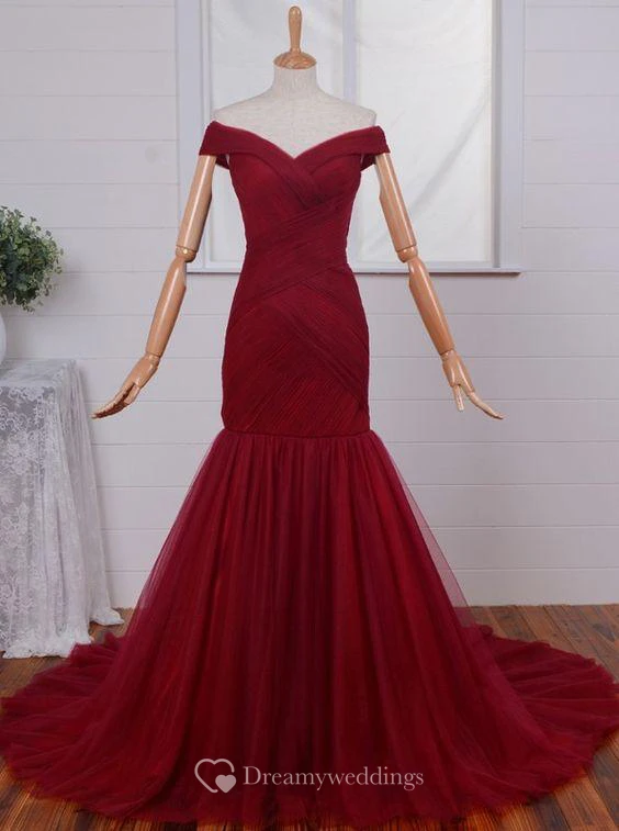 Glamorous Off-the-Shoulder Mermaid Evening Dresses Tulle Burgundy