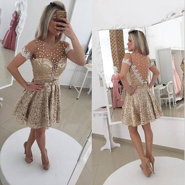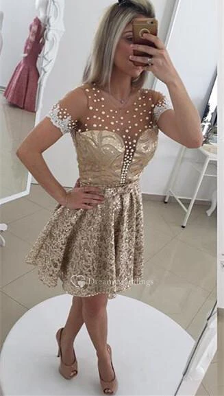 Glamorous Pearls Lace Cocktail Dress Illusion Short Sleeve