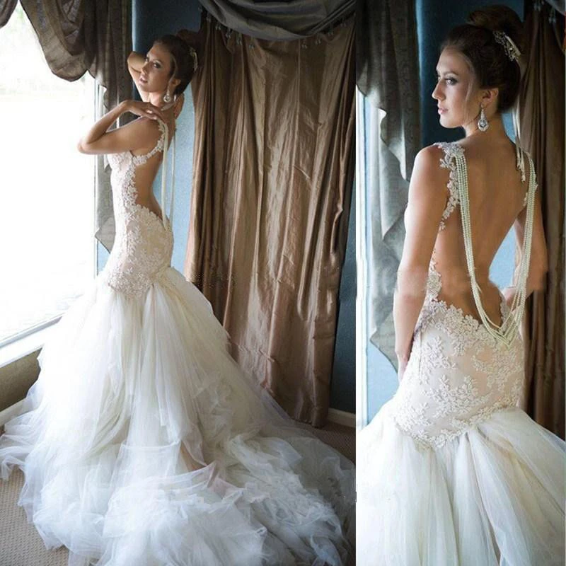 Glamorous Pearls Mermaid Wedding Dress Tulle Lace