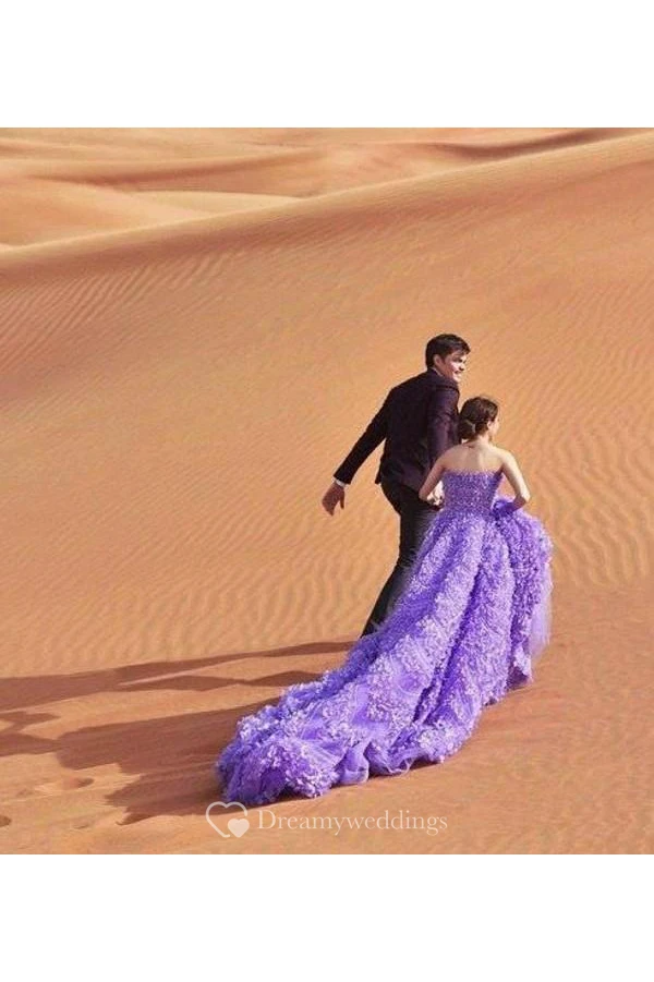 Glamorous Purple Off-the-shoulder Wedding Dress Long Train Flowers