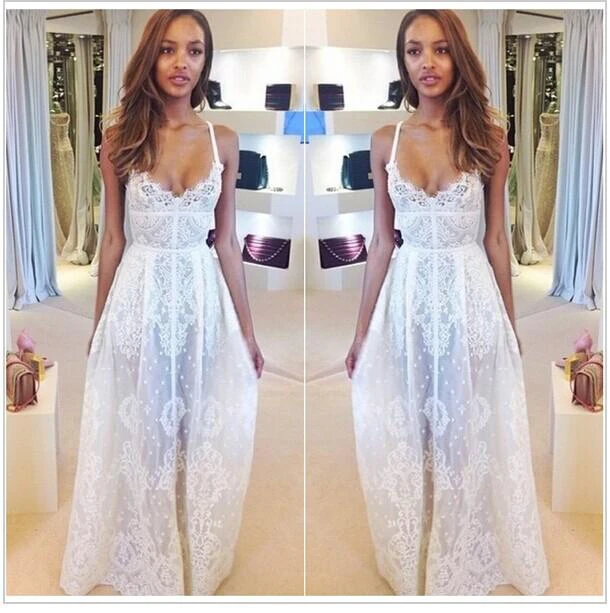 Glamorous Sleeveless Spaghetti Straps Prom Dress With Lace Floor Length Evening Gowns