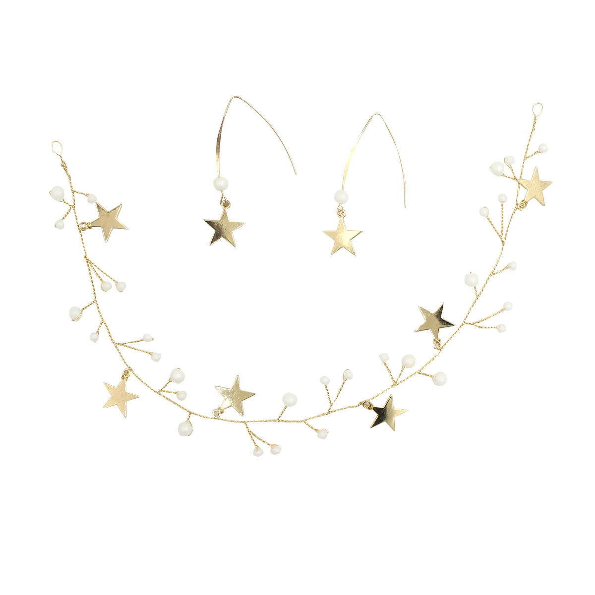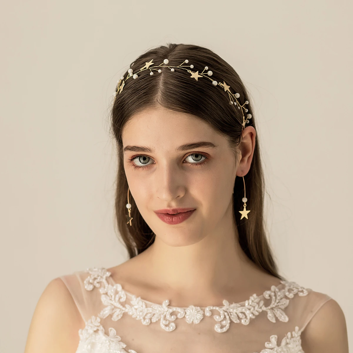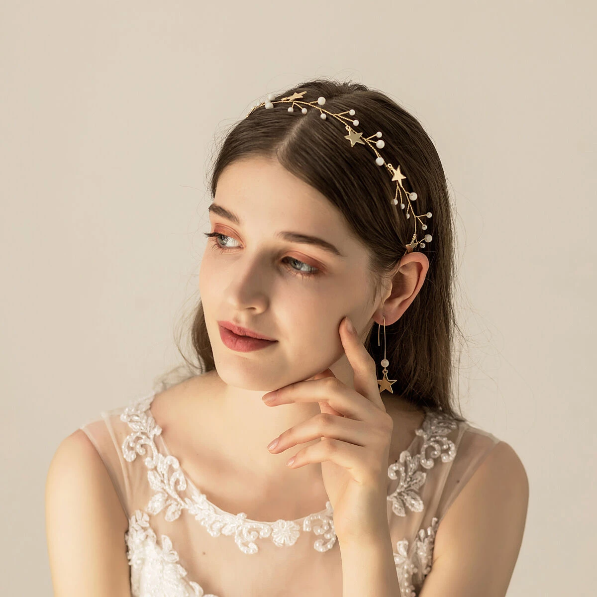 Golden Beaded Bridal Headbands and Earrings with Stars