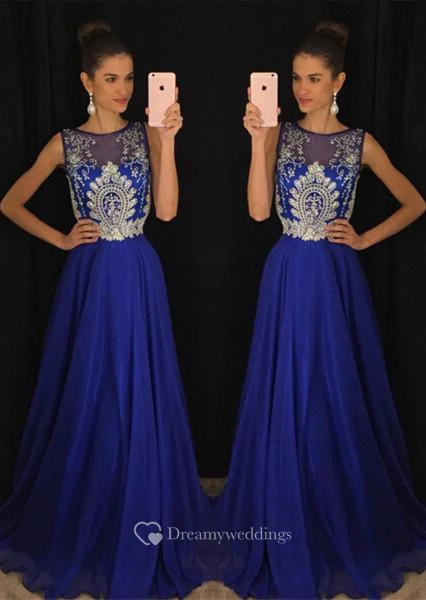 Gorgeous Dark Royal Blue Sleeveless Evening Dresses Long Chiffon With Appliques Beadings