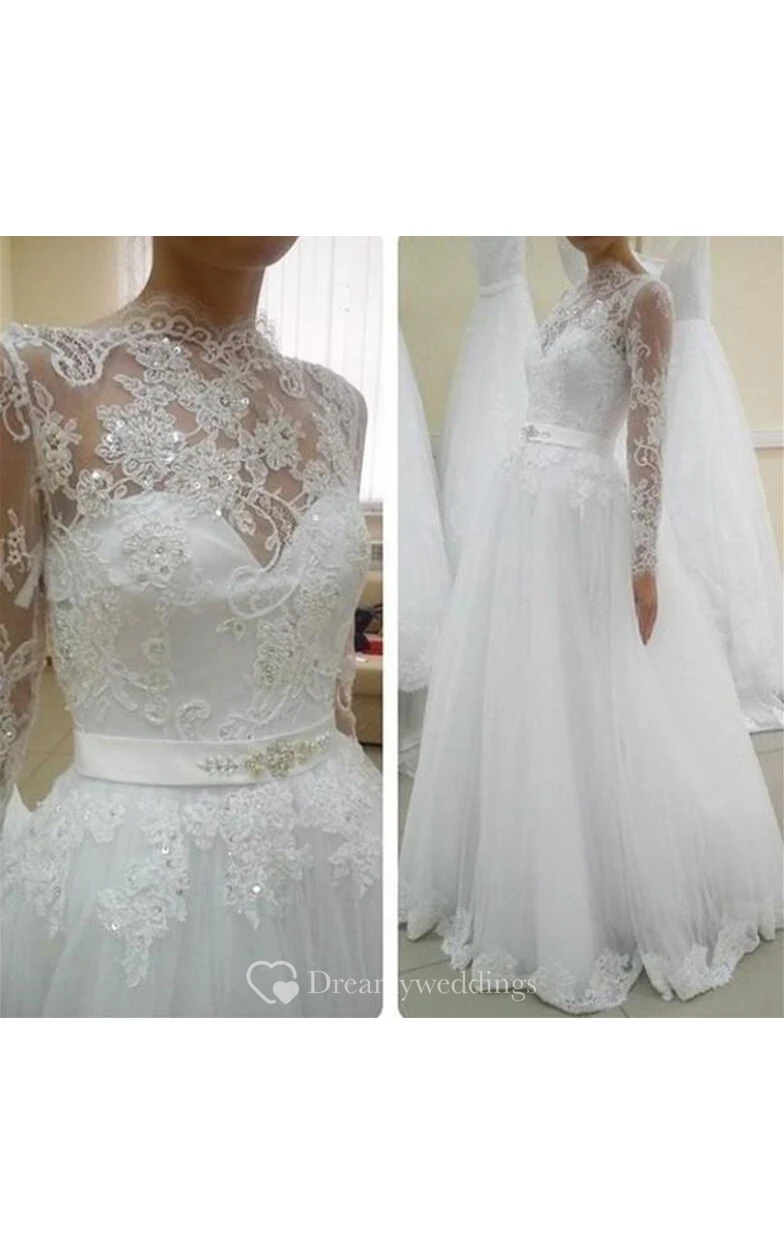 Gorgeous High Neck Long Sleeve Tulle A-line Gown With Sash