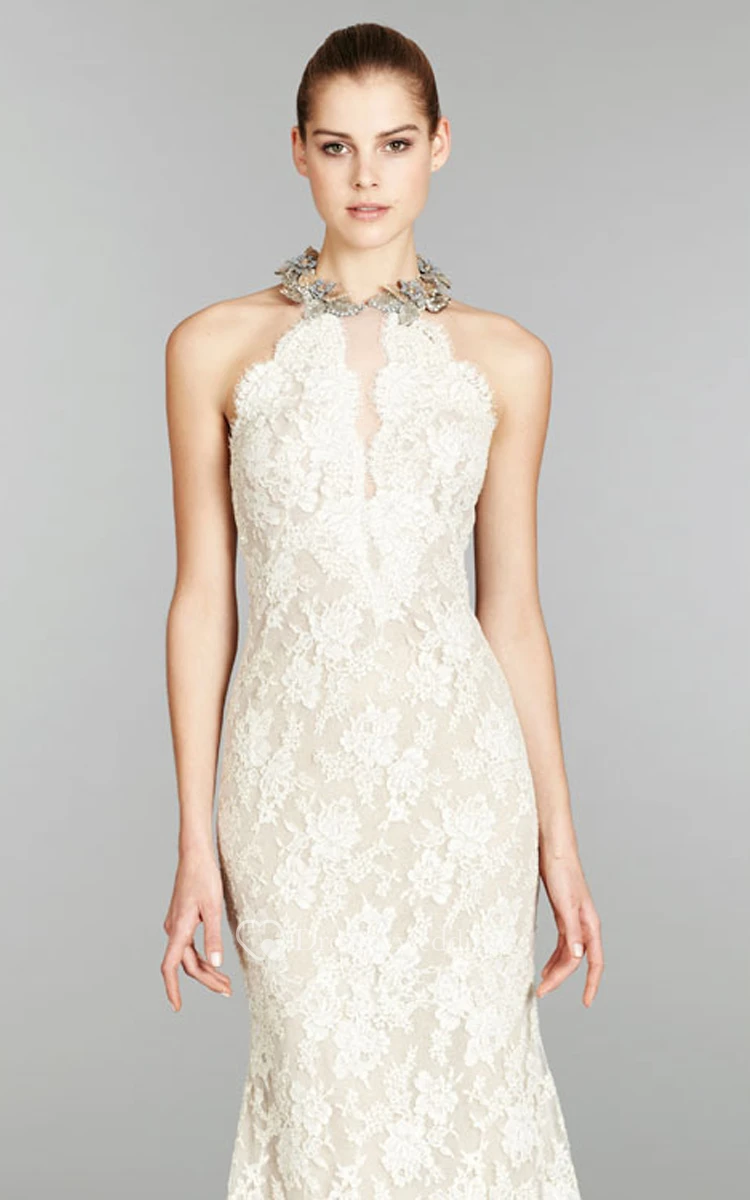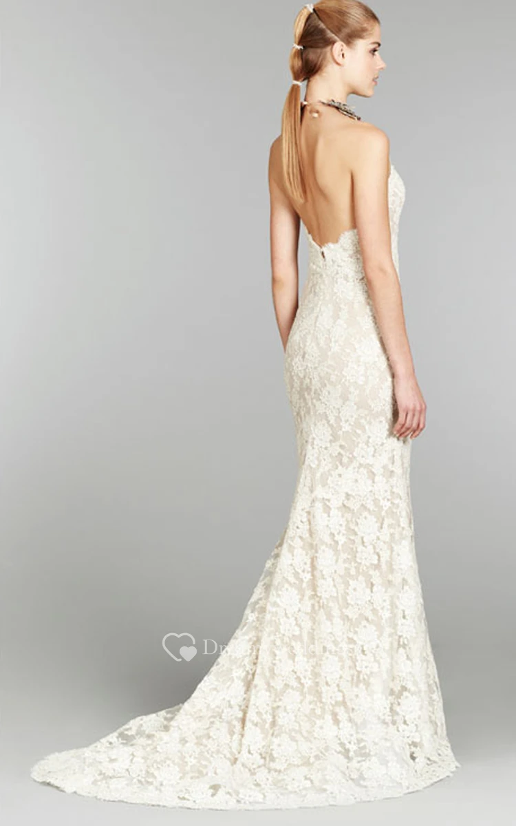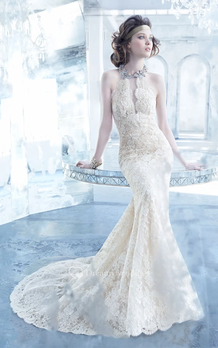 Gorgeous Scalloped Halter Neckline Lace Gown With Open Back