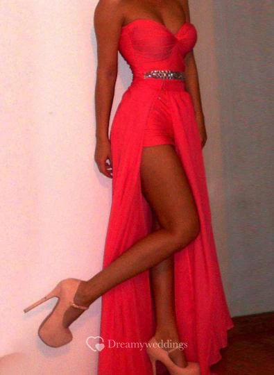 Gorgeous Sexy Red Long Prom Gowns Sweethear Slit Chiffon Evening Dresses With Beadings