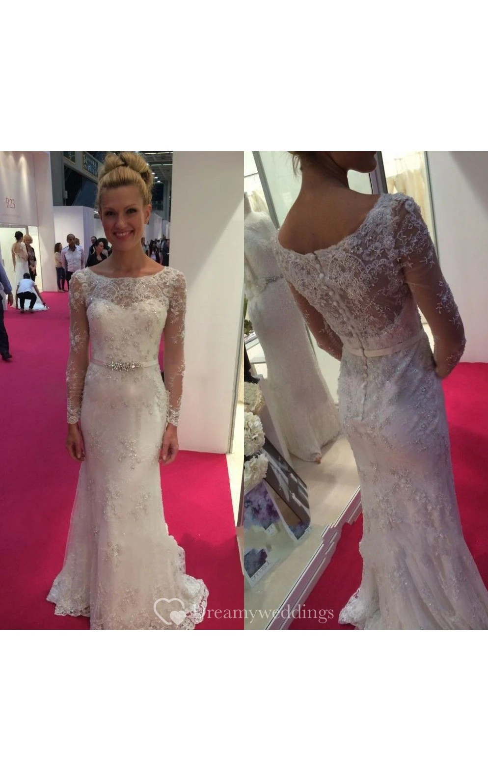 Graceful Bateau Neckline Long-sleeved Lace Long Dress Crystal Sash