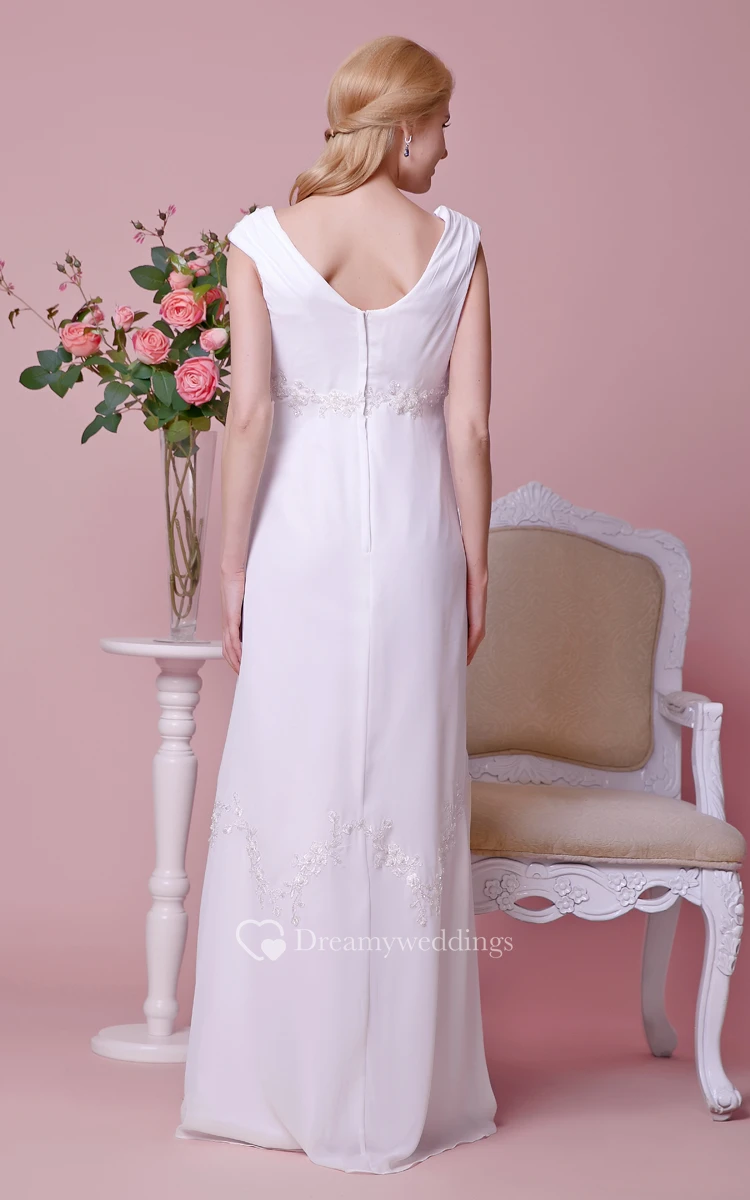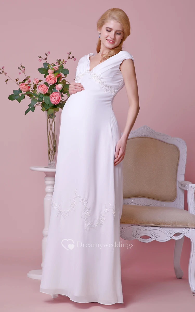 Graceful V-neck V-back A-line Chiffon Long Dress With Cap Sleeves