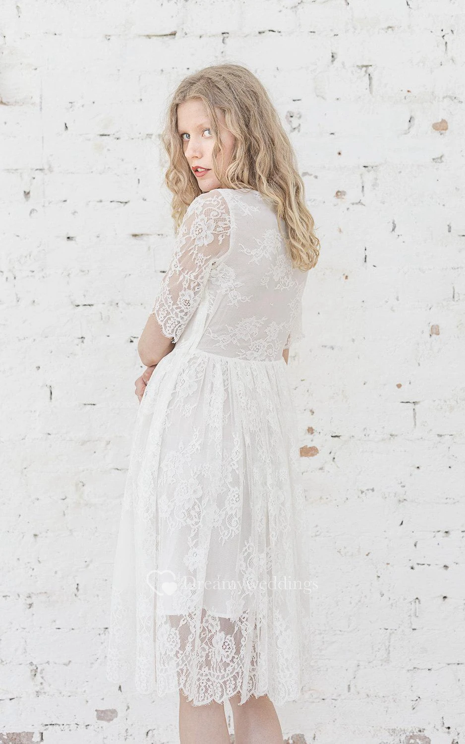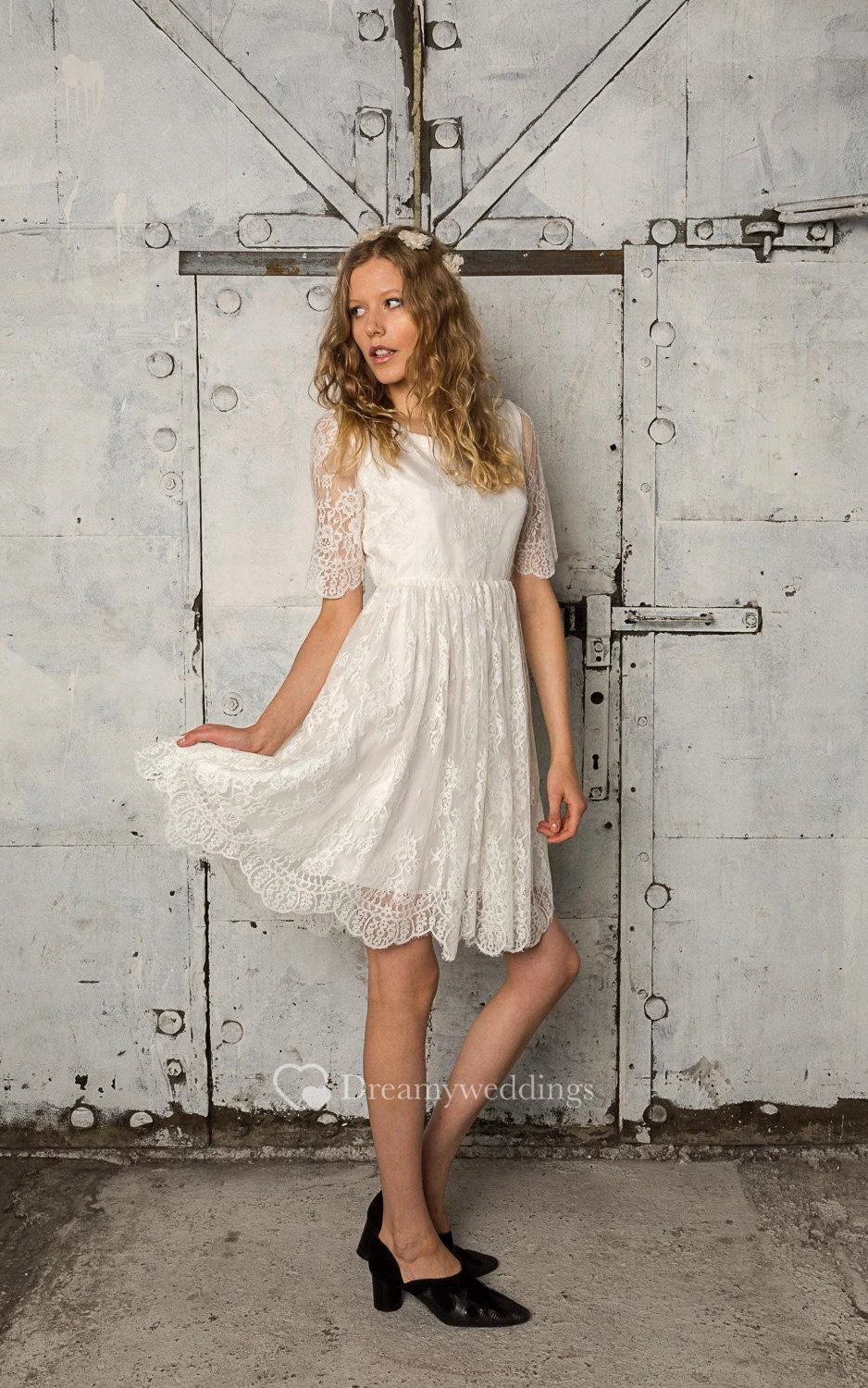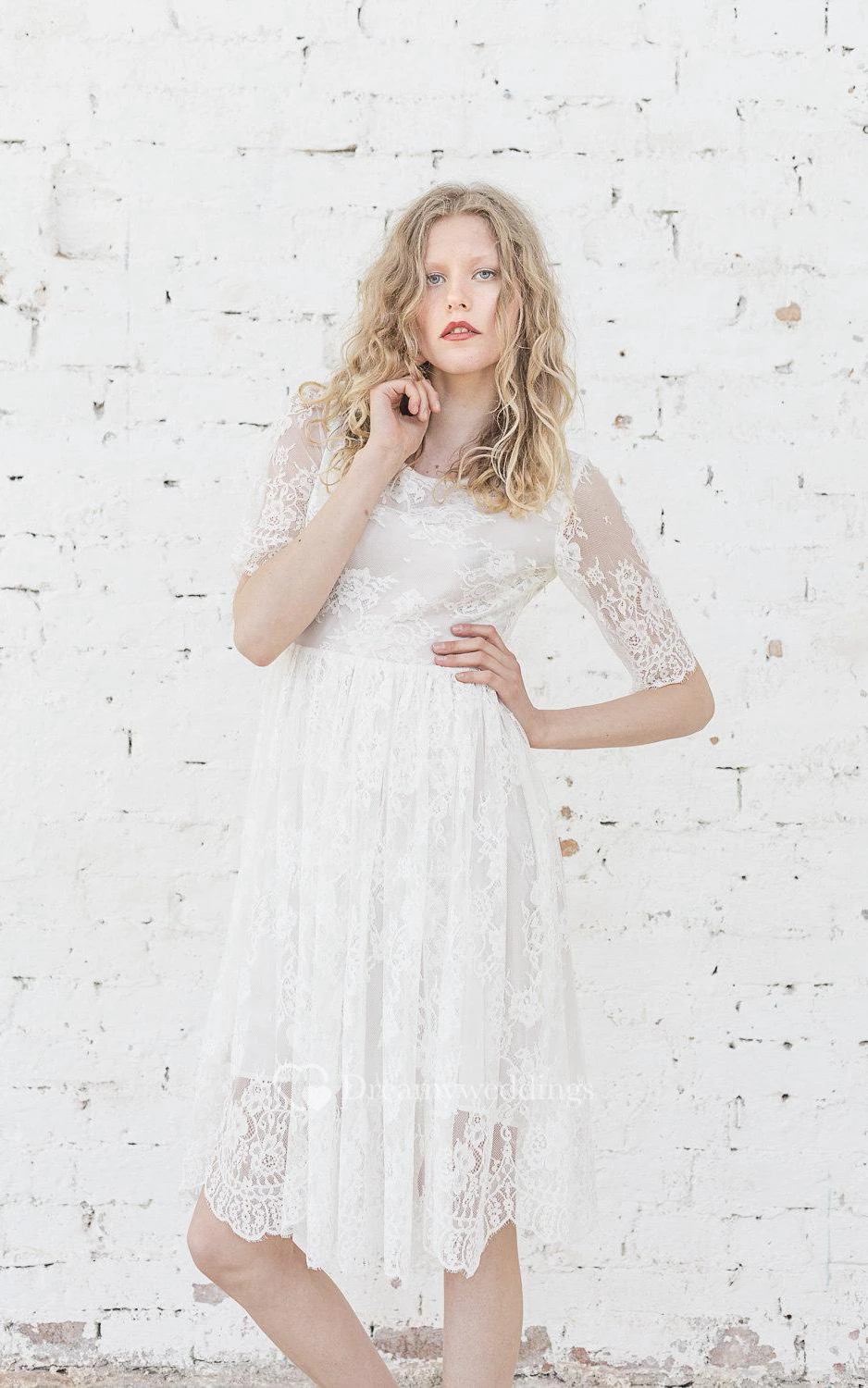 Half Sleeve A-Line Bateau Neck Lace Dress With Asymmetrical Hemline