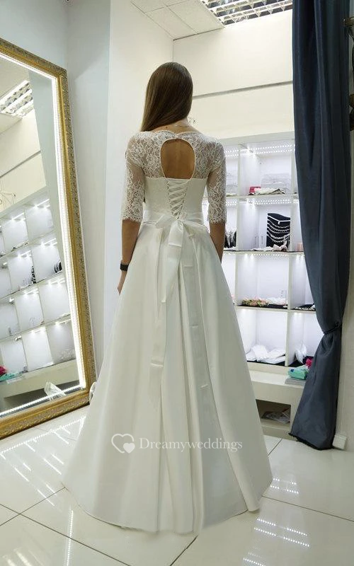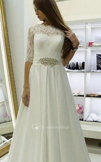 Half Sleeve Lace and Satin Dress With Beadwork and Pleats