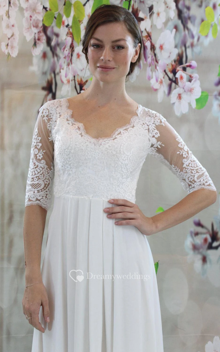 Half Sleeve V-Neck Keyhole Back Chiffon Dress With Lace Bodice and Pleated Skirt
