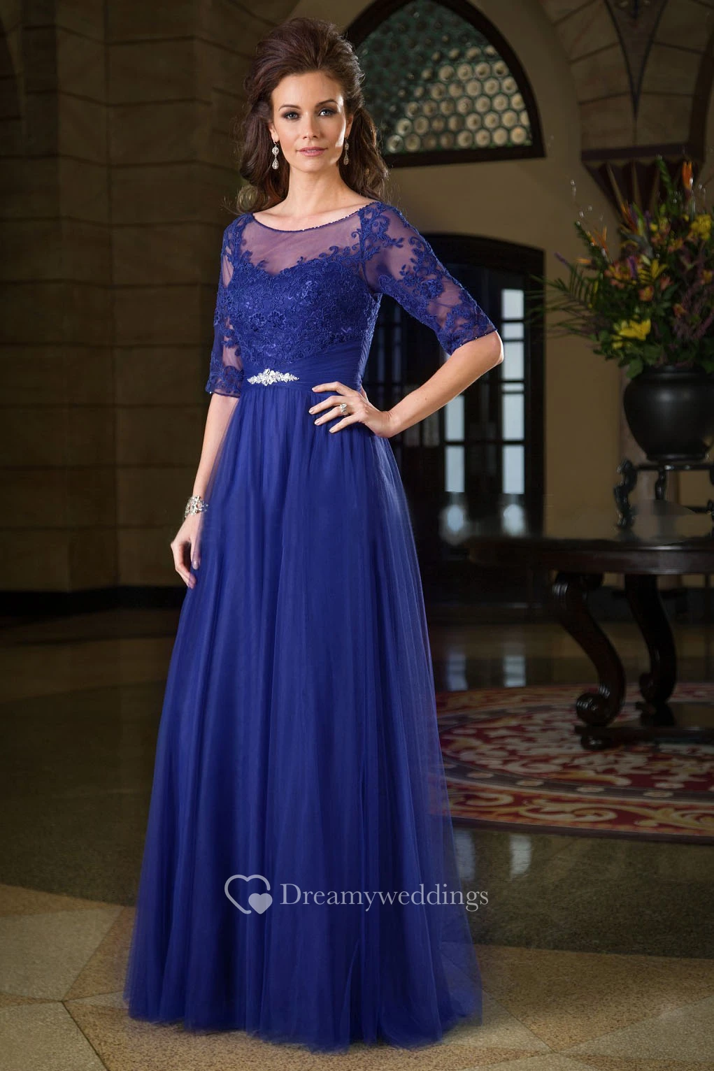 Half-Sleeved A-Line Gown With Appliques And Pleats