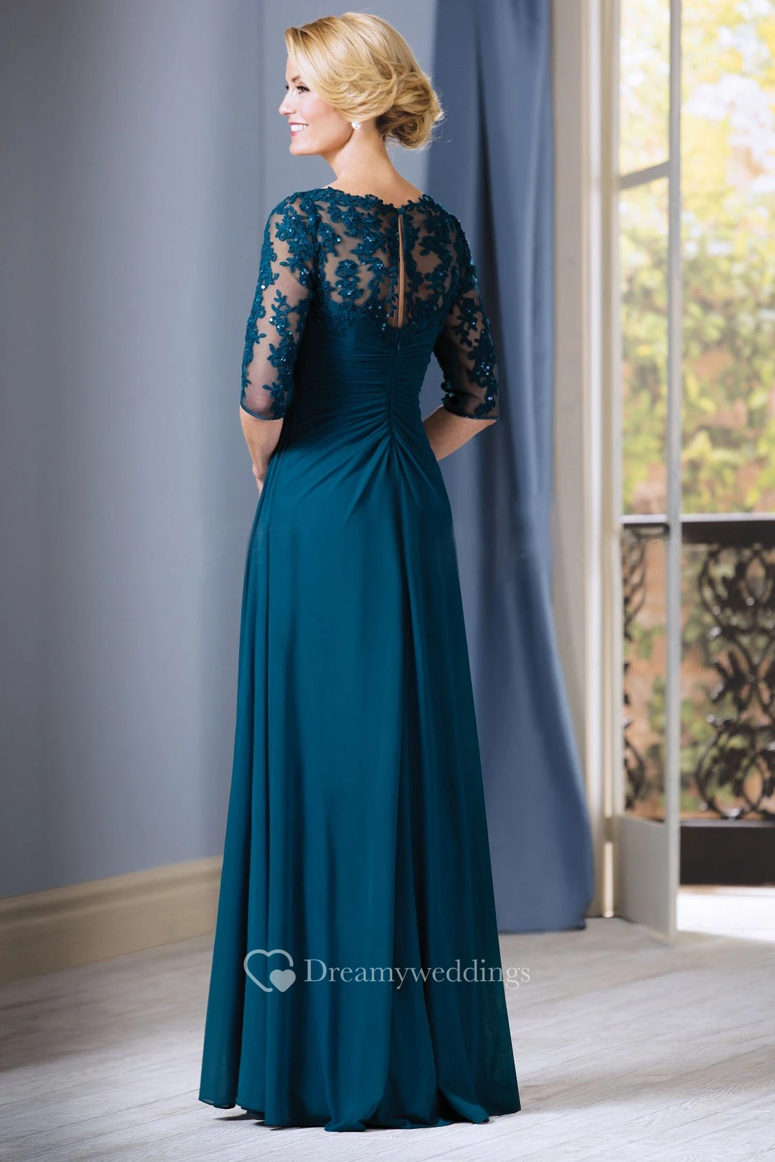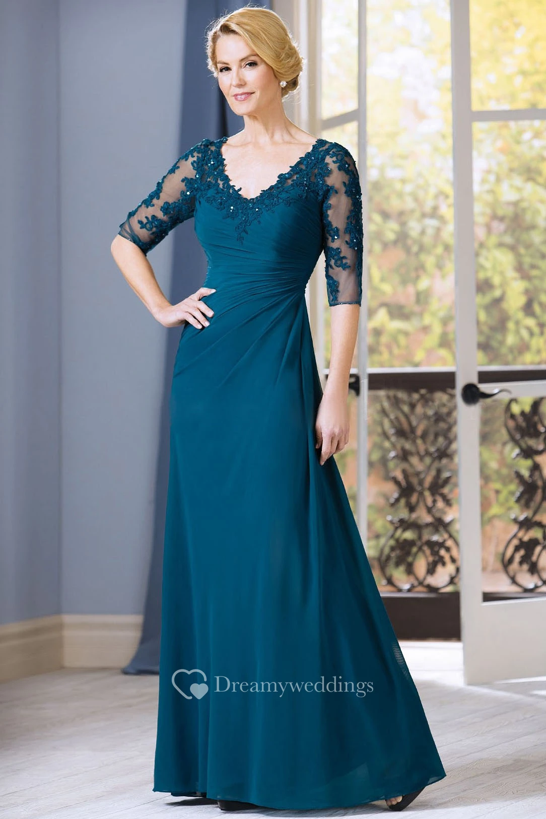 Half-Sleeved V-Neck Long Mother Of The Bride Dress With Sequins And Appliques