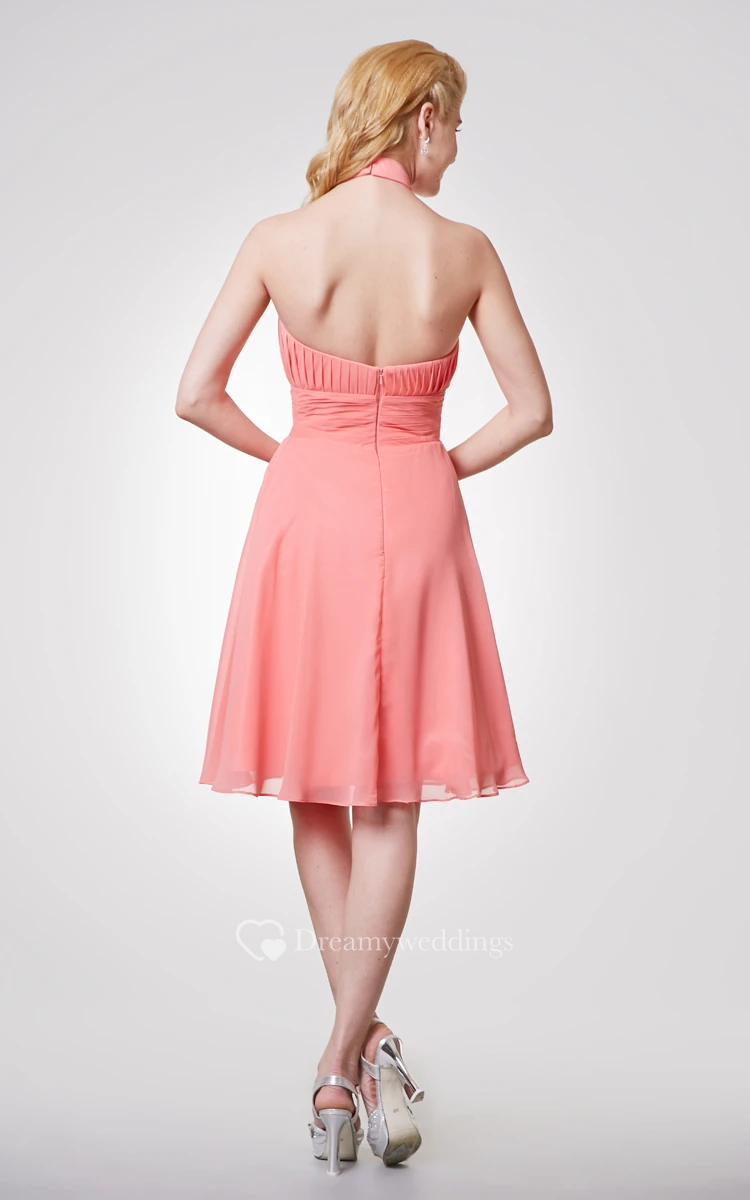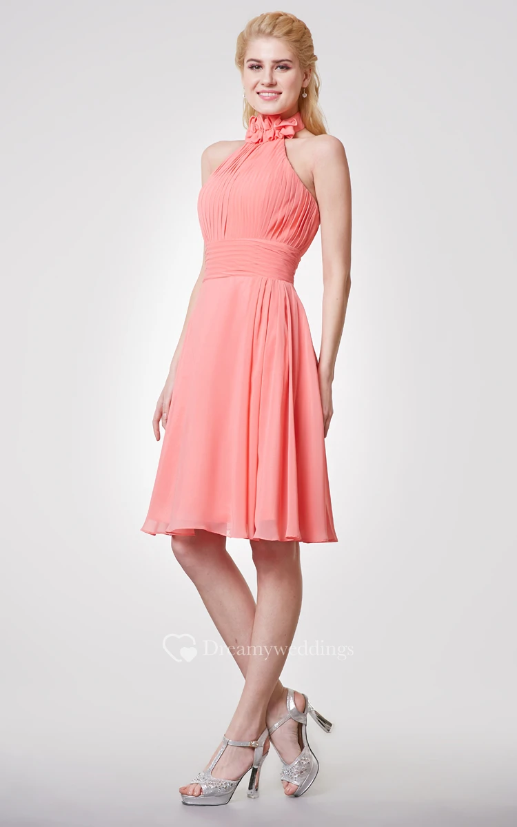 This feminine and flirty halter floral neckline a-line knee length chiffon dress is the perfect choice for any fashionable bridal party. A flattering classic halter neckline is accented by dazzling floral rosettes across the collar and delicate ruching throughout the bodice of the gown. A ruched bandage style waistline slims the figure and complements the flowy knee-length chiffon skirt beautifully.