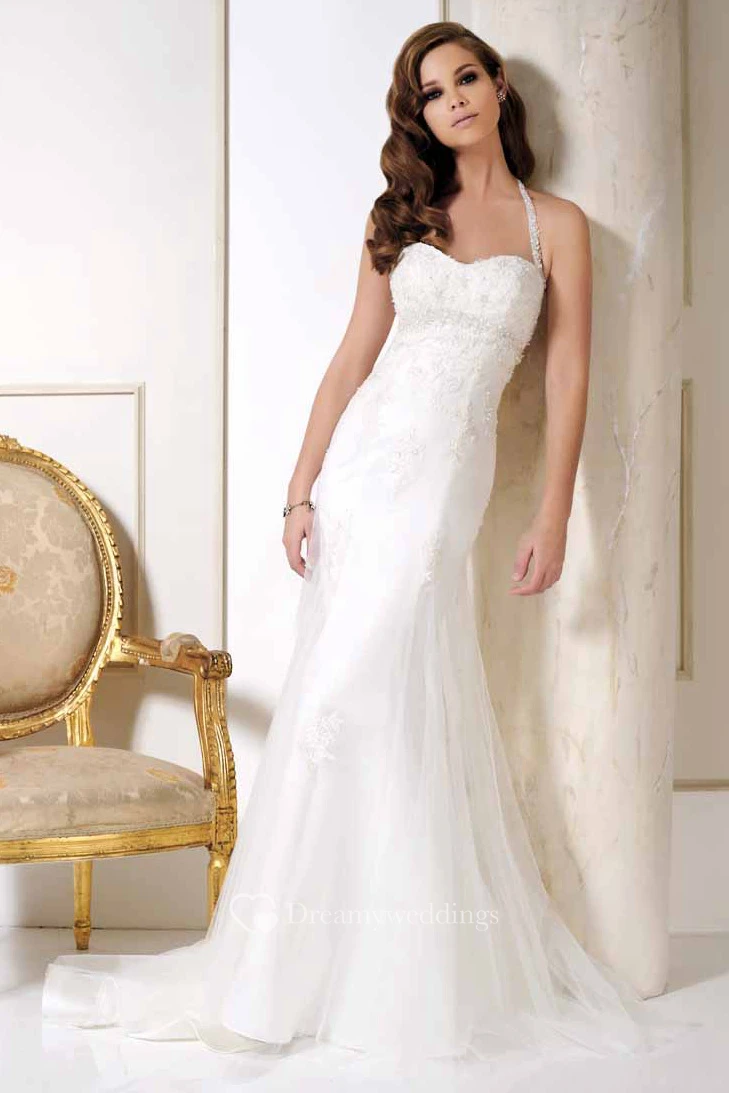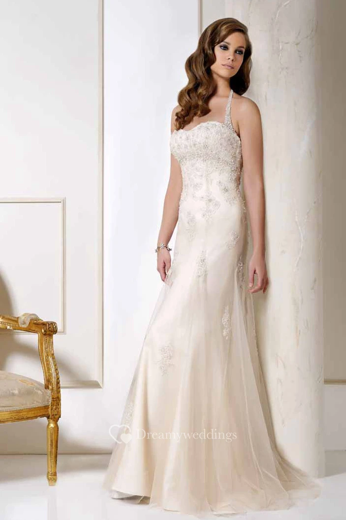 Halter Long Appliqued Tulle Wedding Dress With Court Train And V Back