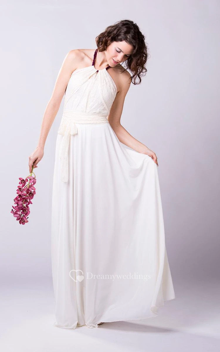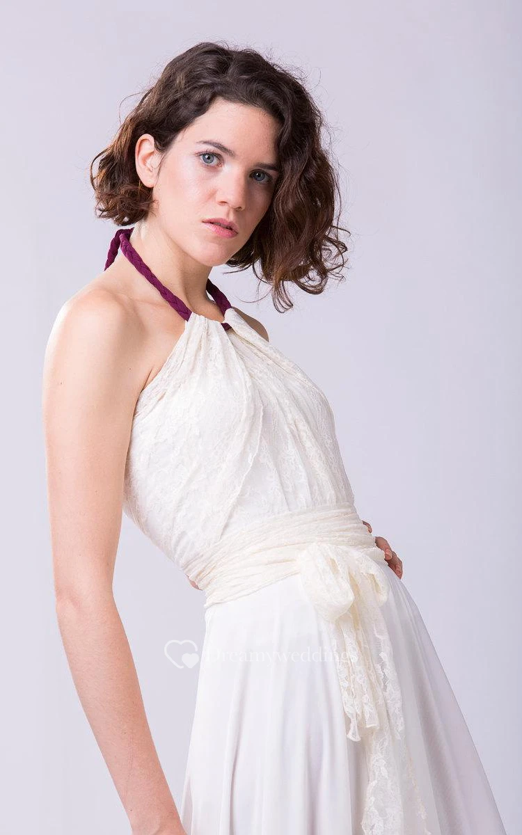 Halter Pleated A-Line Chiffon Gown With Lace Bodice