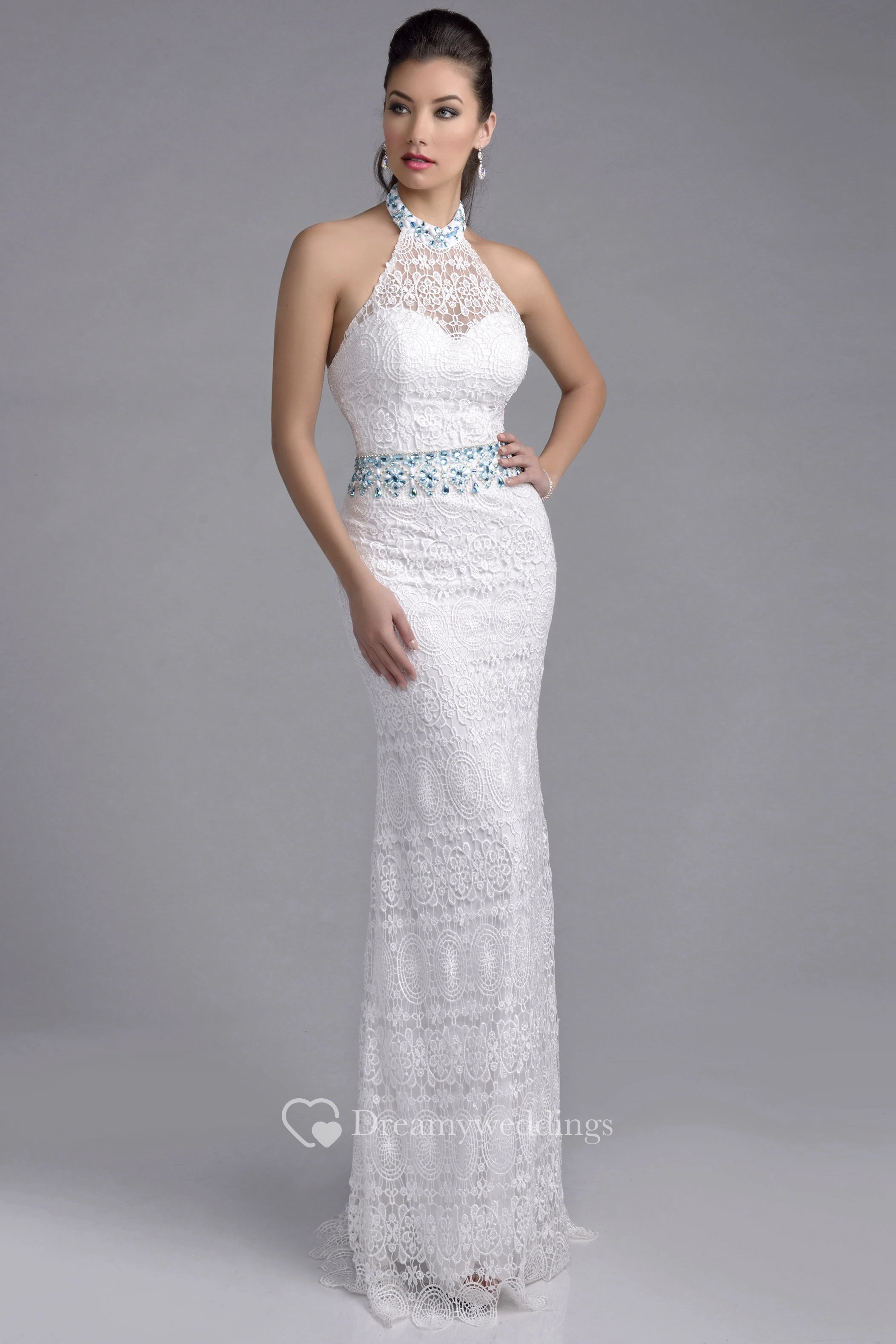 Halter Sheath Lace Prom Dress With Rhinestones On Waist And Neck