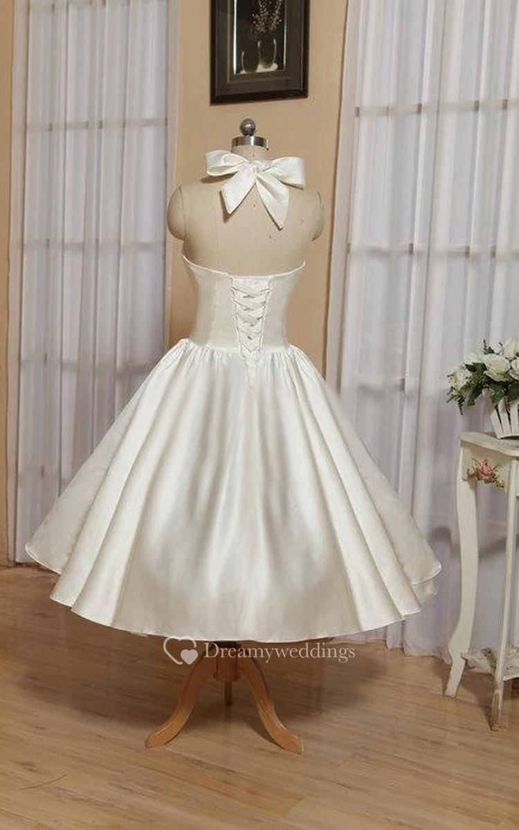 Halter Tea-Length Satin Wedding Dress With Bow And Lace-Up Back