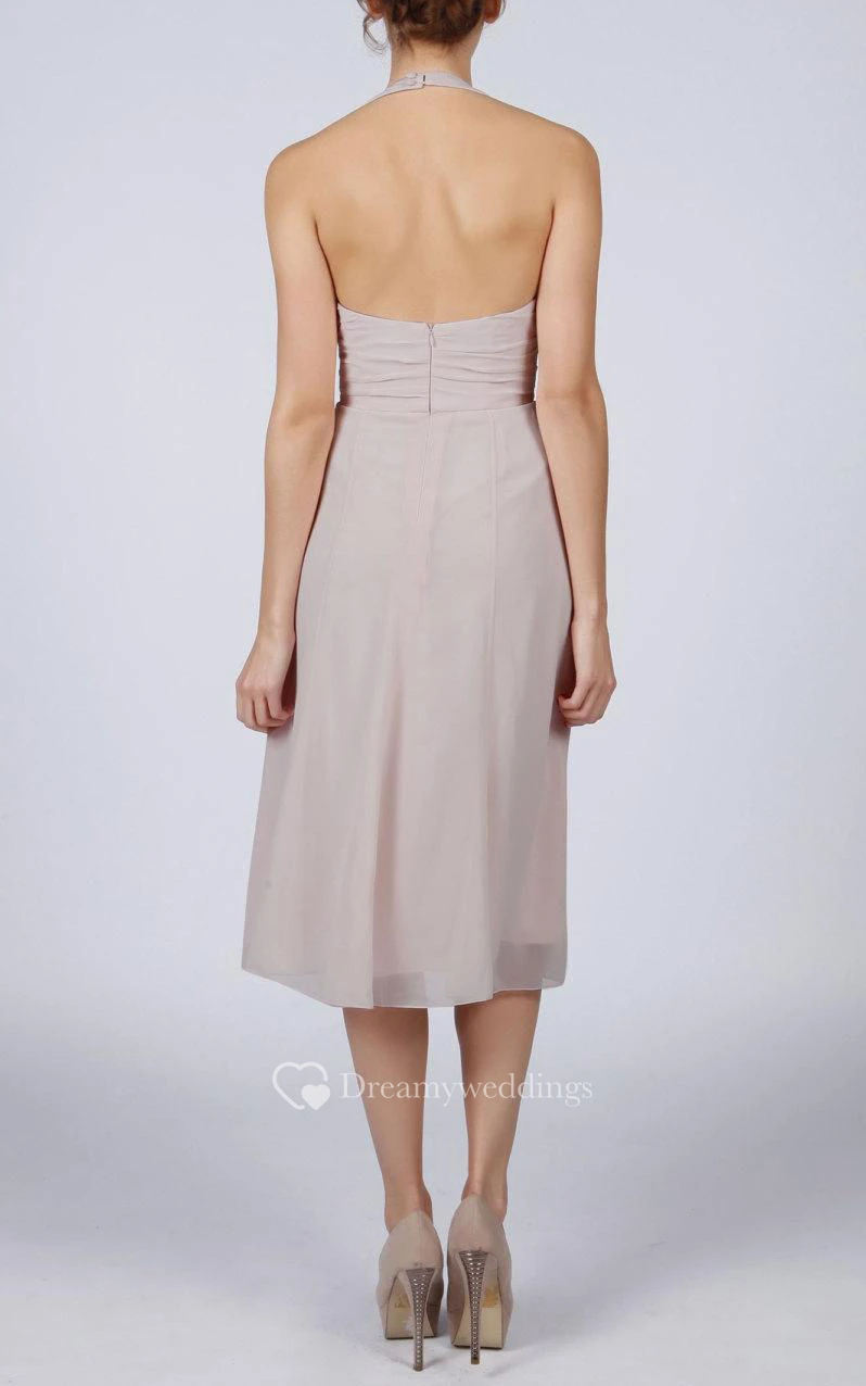 Halter V Neck A-line Chiffon Tea Length Dress Silver