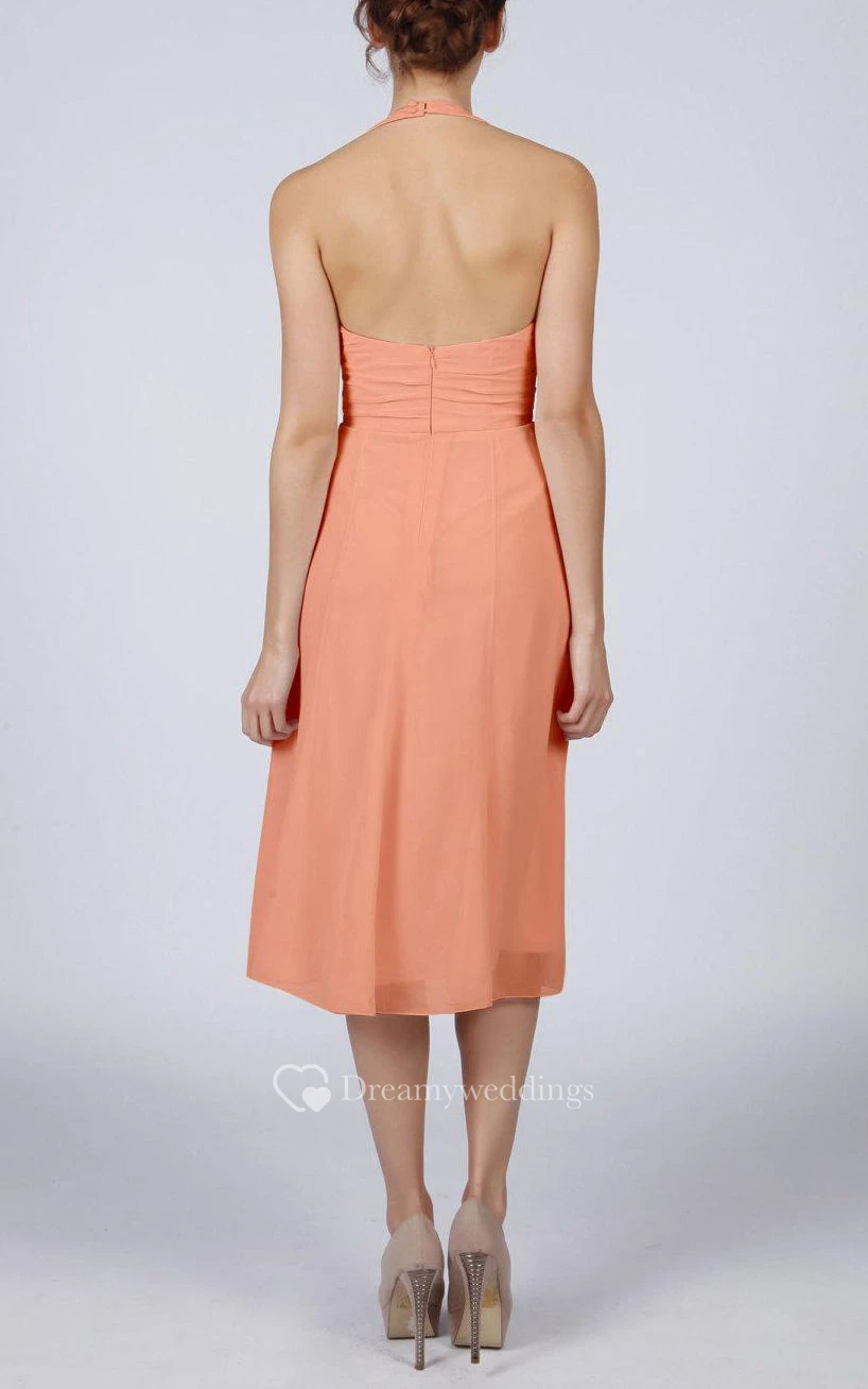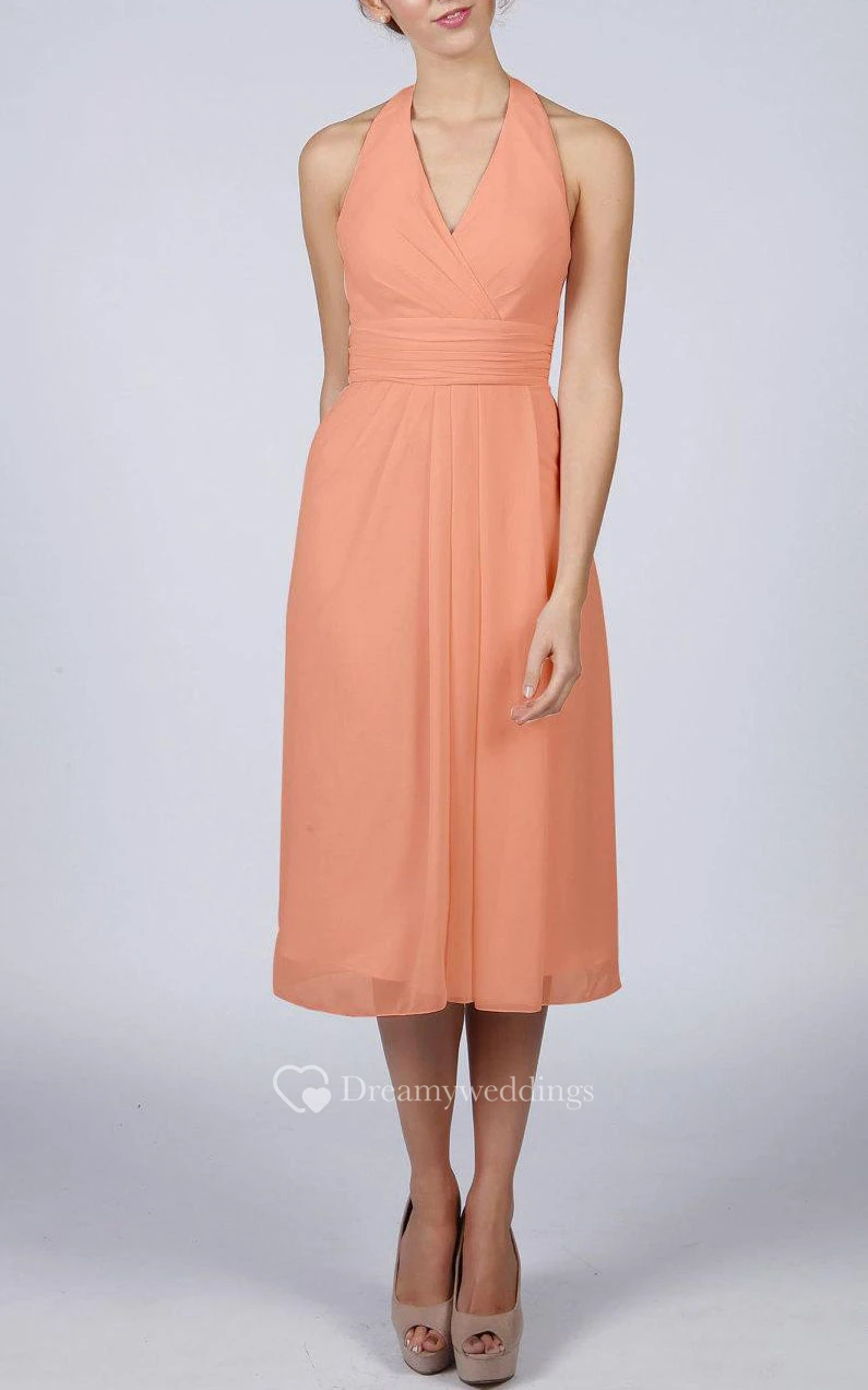 Halter V Neck A-line Chiffon Tea Length Dress With Pleats