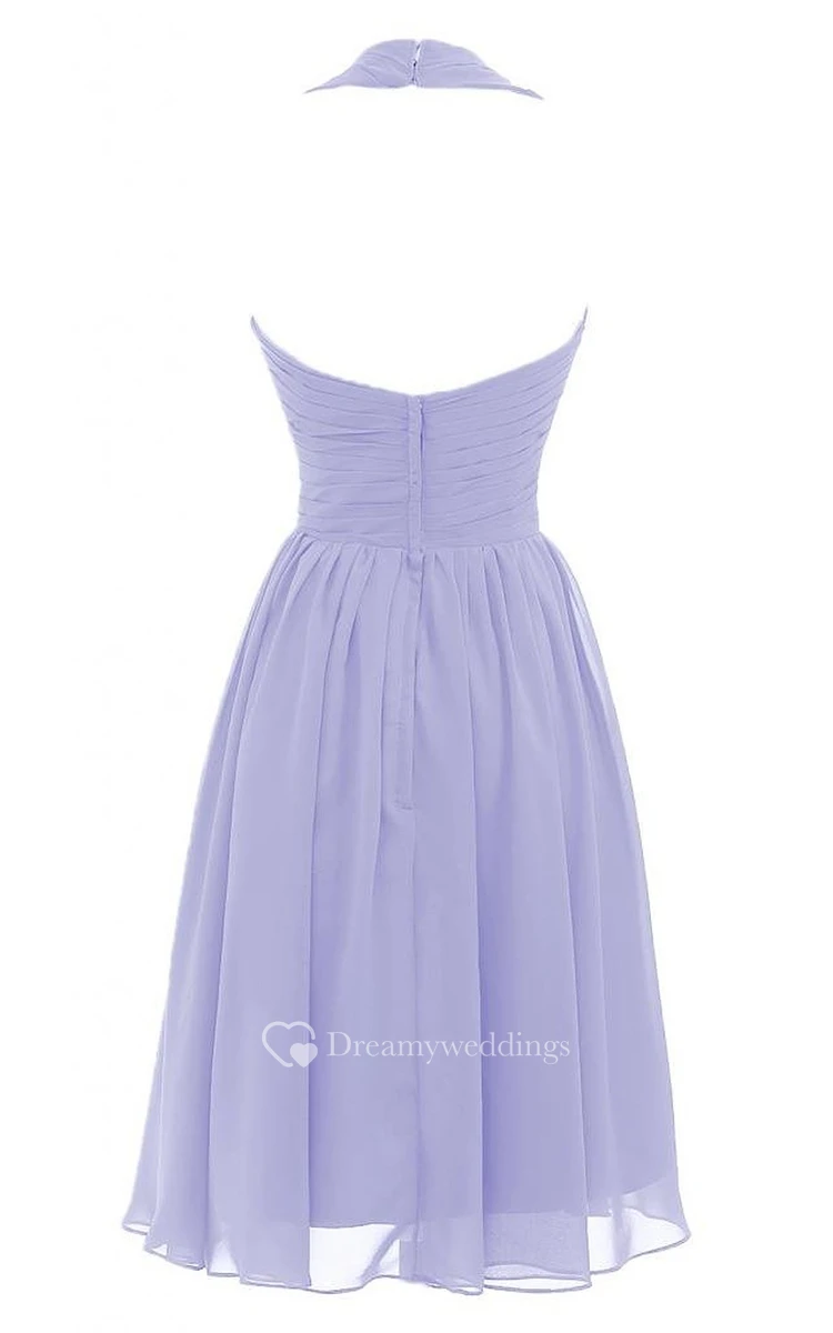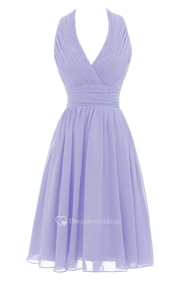 Halter V-neck Pleated Short Dress With Ruched Band