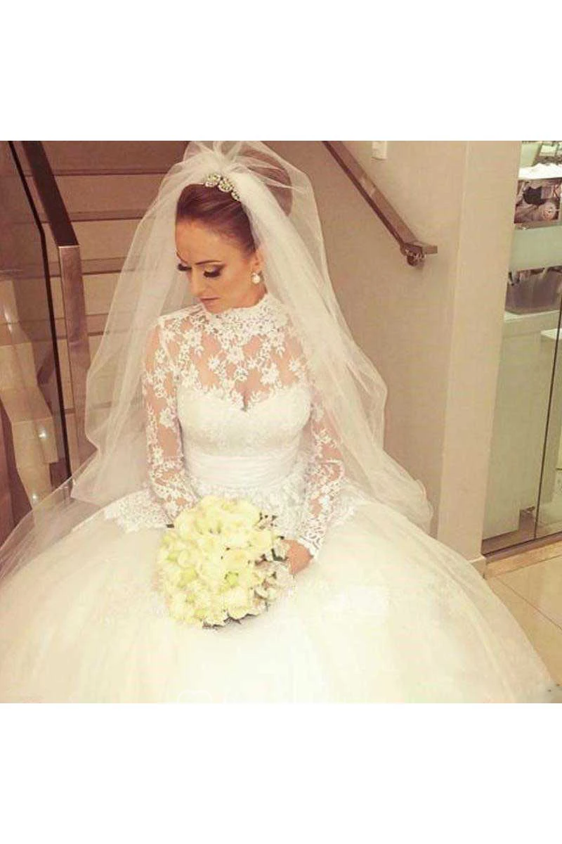High Collar A Line Modest Princess Appliques Long Sleeve Lace Bridal Gown