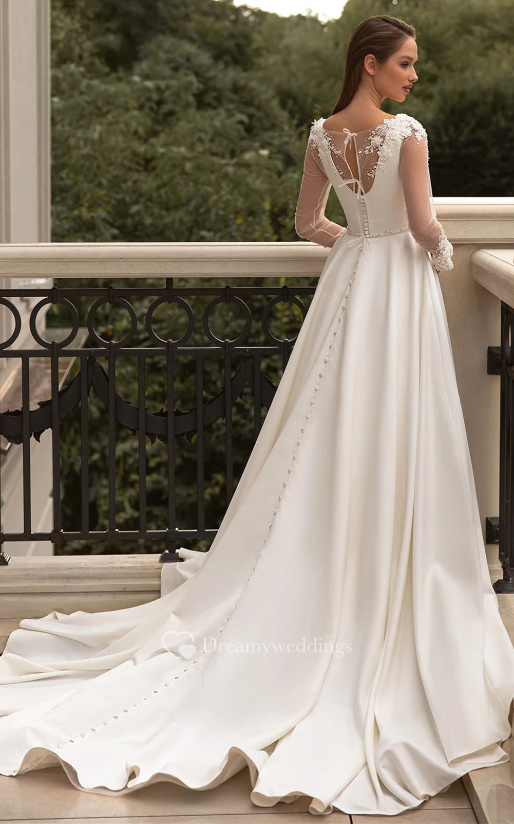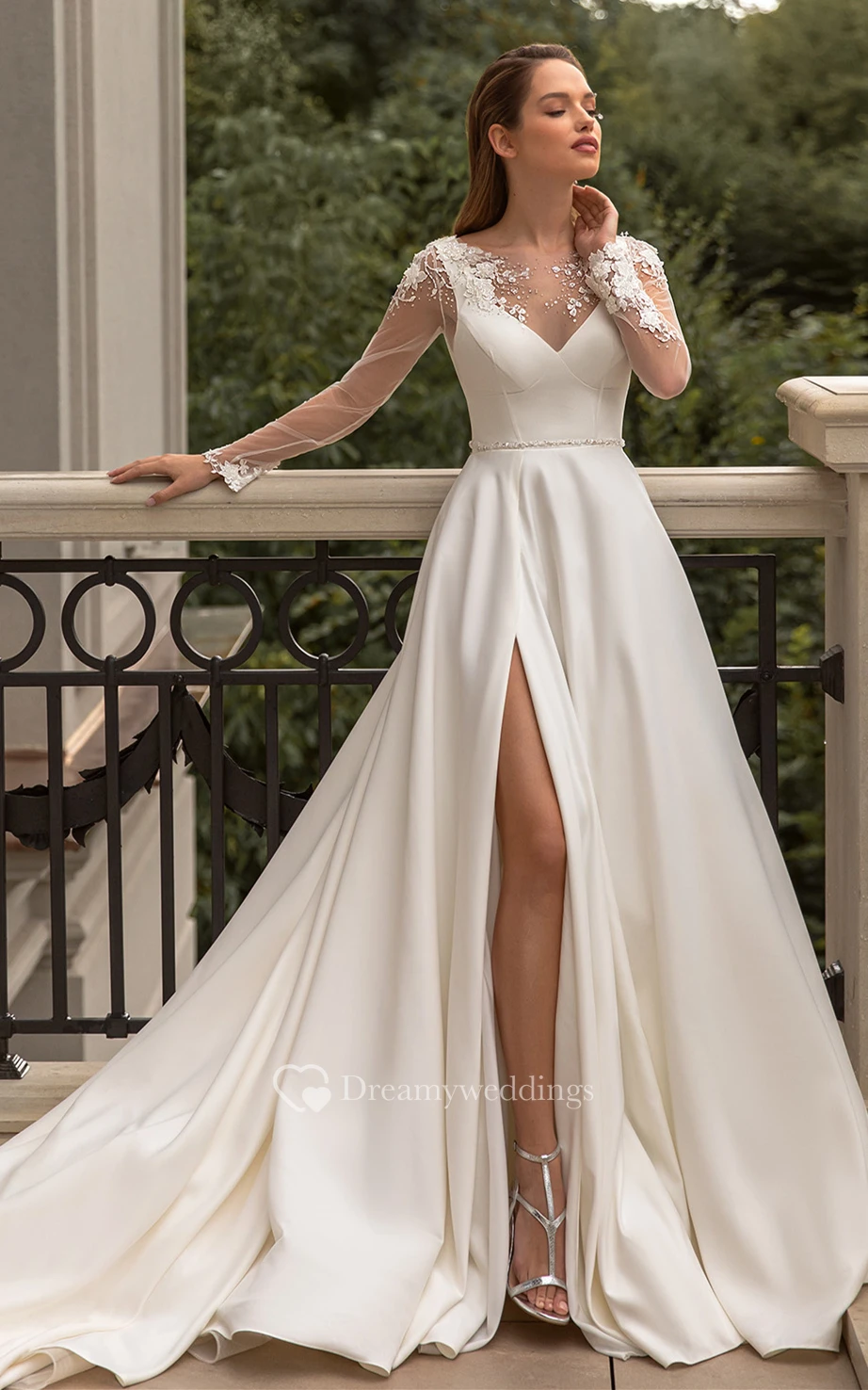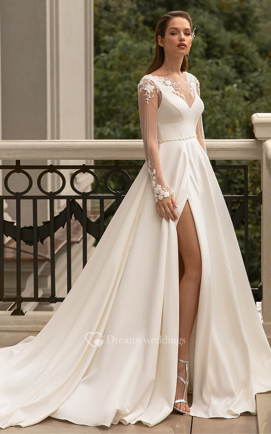 High-end A Line Satin V-neck Chapel Train Wedding Dress with Split Front