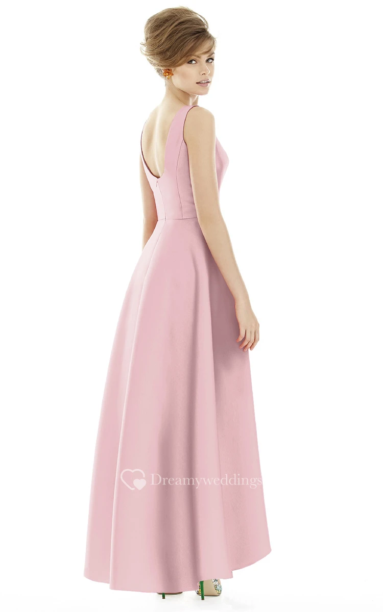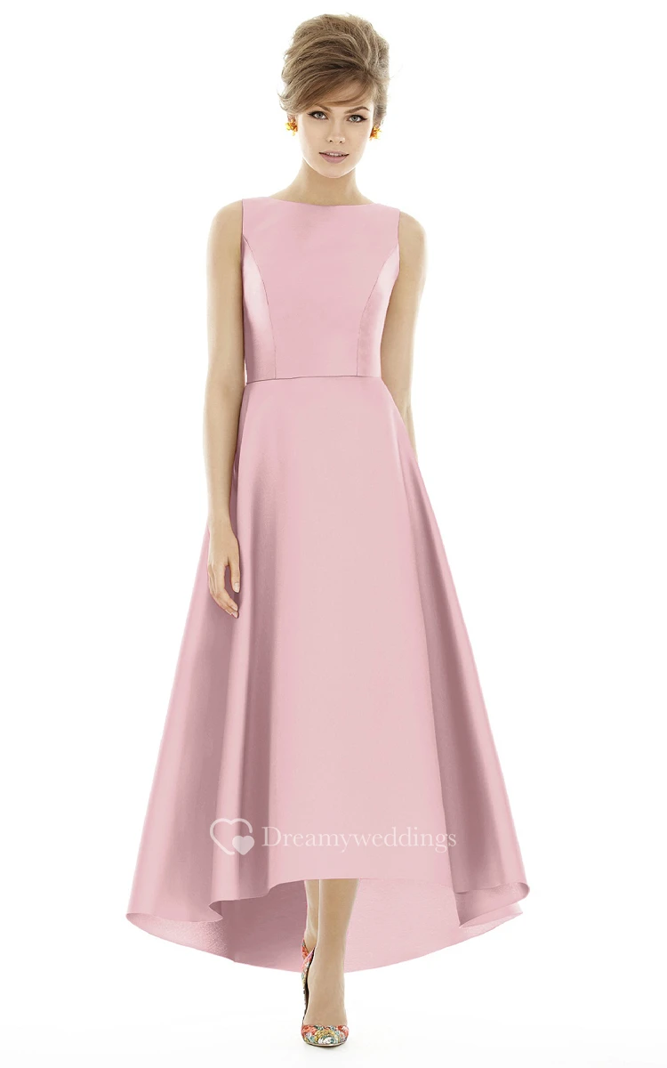 High-Low Jewel Sleeveless Satin Dress with V-Back and Ruching