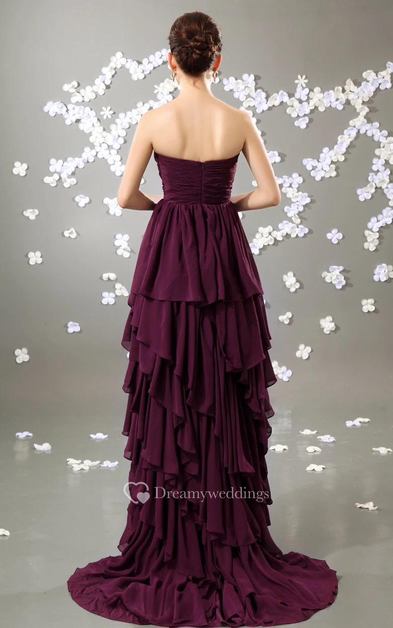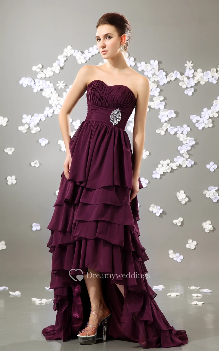 High-Low Sweetheart Dress With Tiers and Broach