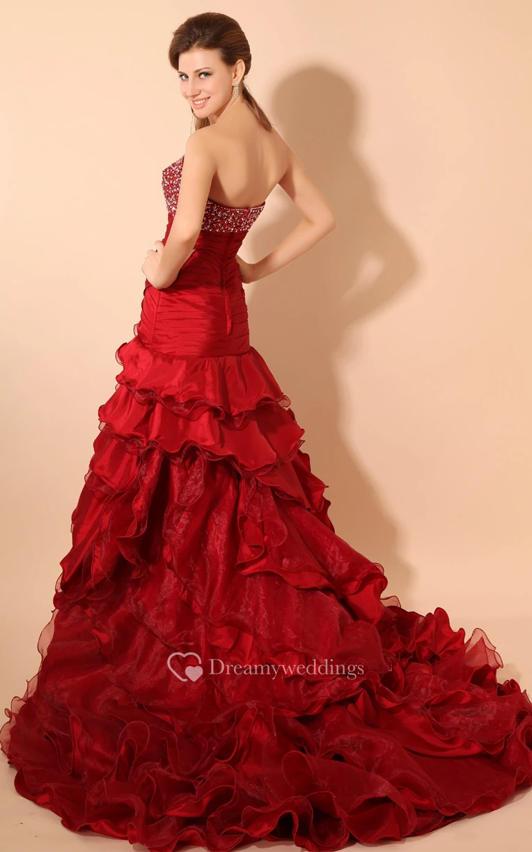 High-Low Taffeta Dress With Ruffled Train and Beaded Top