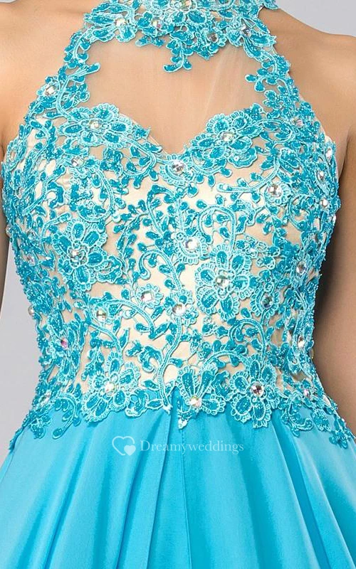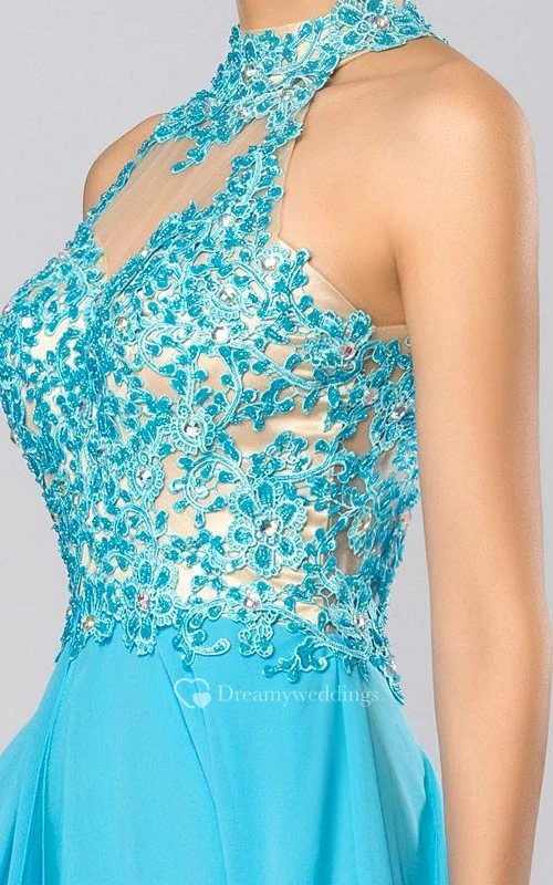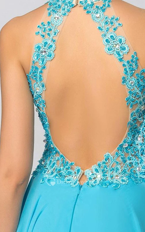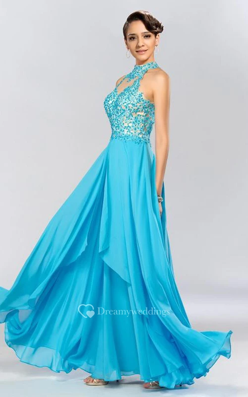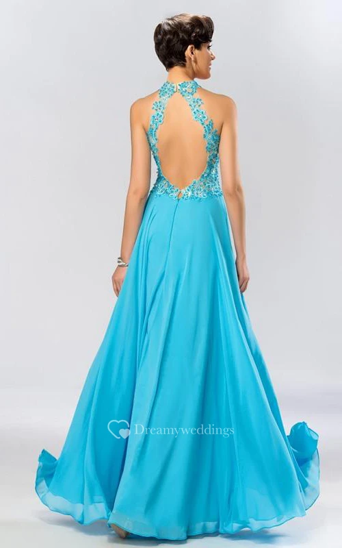 High Neck Appliques Beading Backless Long Prom Dress
