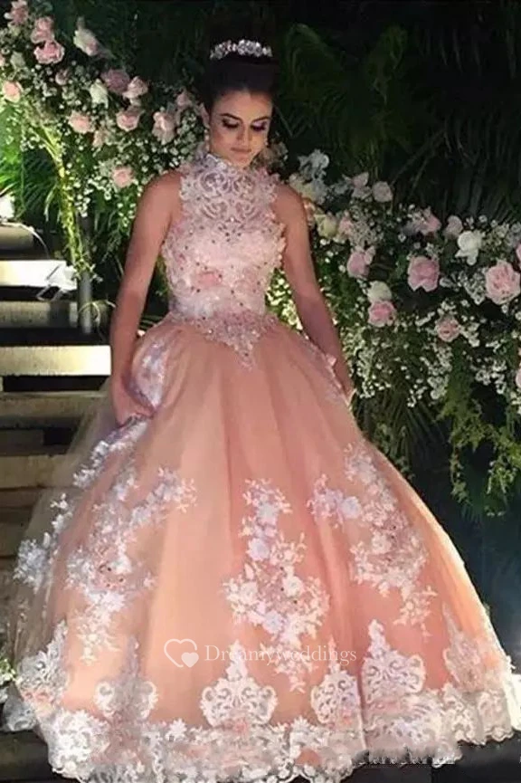 High Neck Ball Gown Floor-length Sleeveless Lace Tulle Prom Dress with Zipper Back