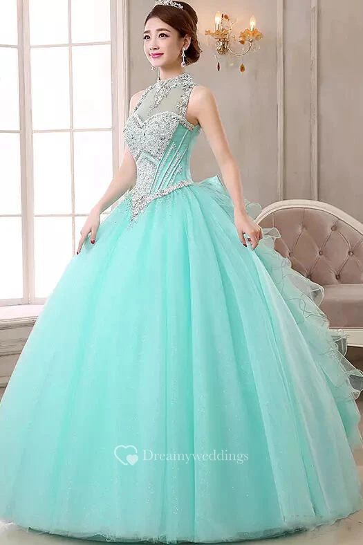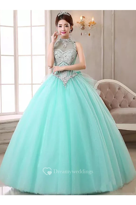 High Neck Ball Gown Floor-length Sleeveless Organza Tulle Prom Dress with Lace-up Keyhole Back