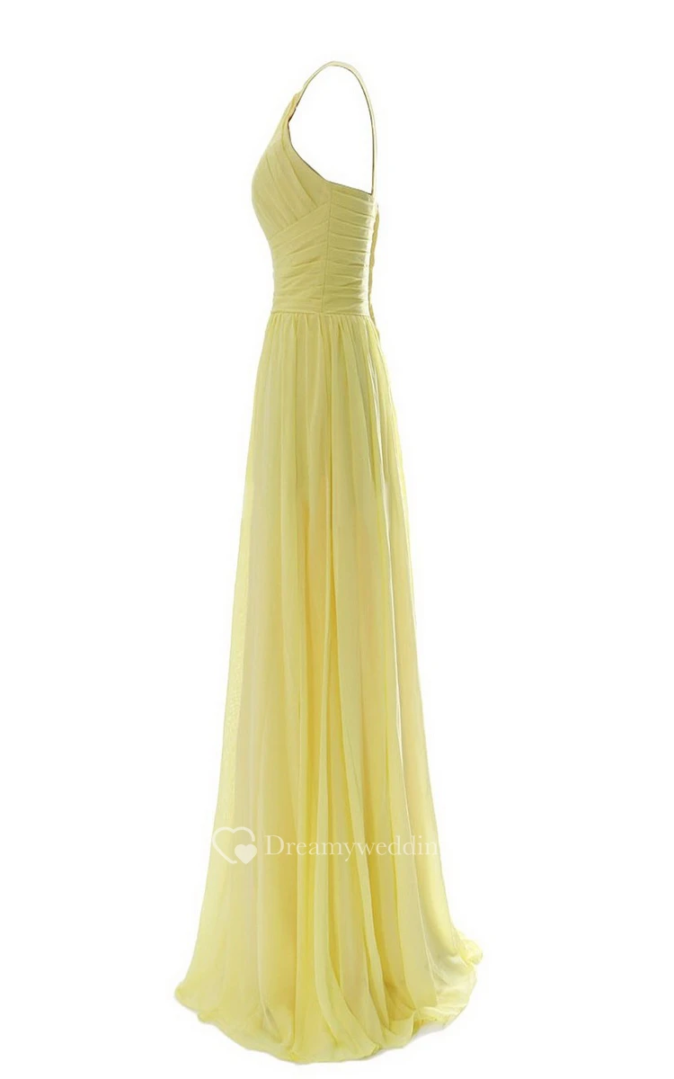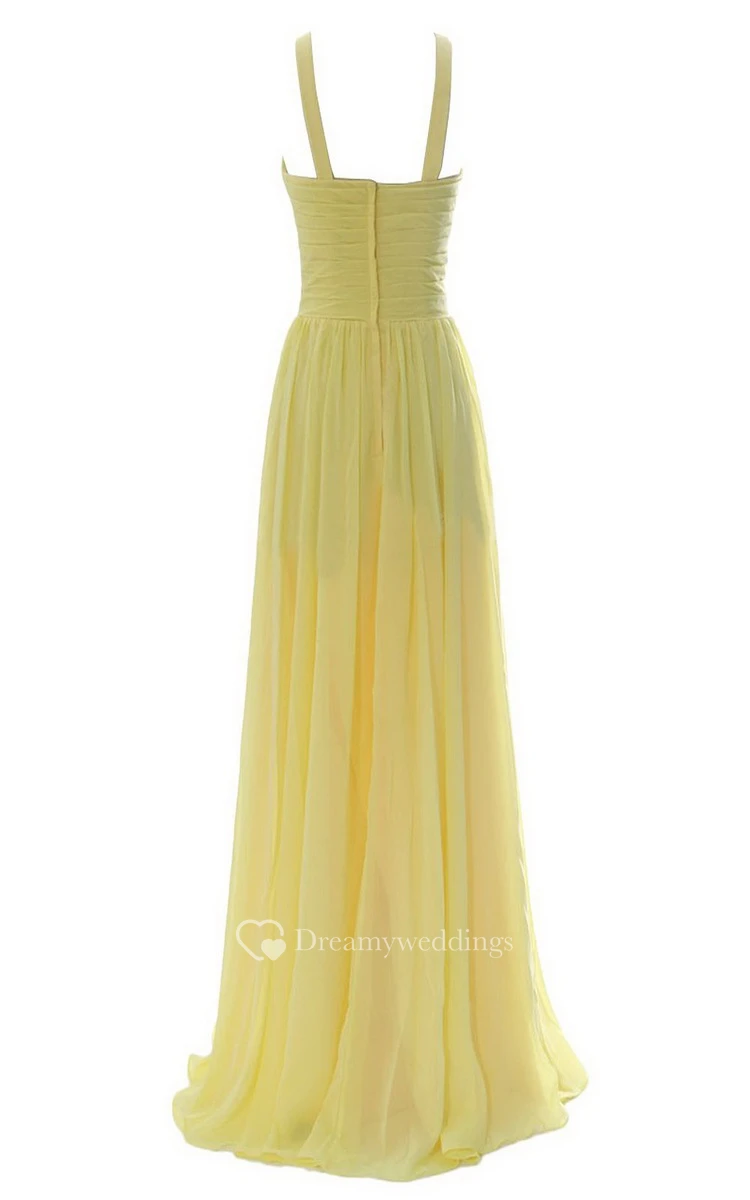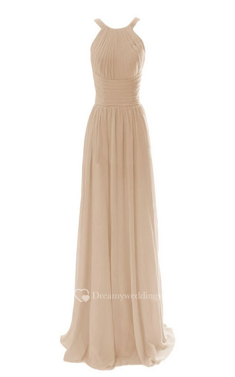 High-neck Long Chiffon Dress With Ruched Waist