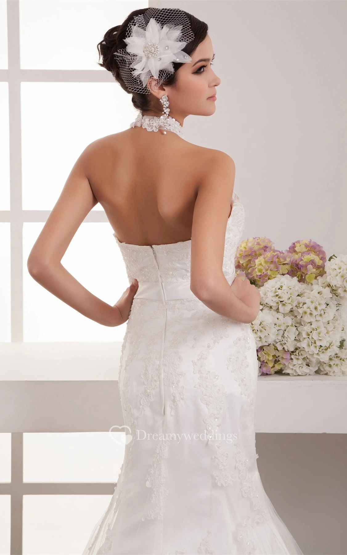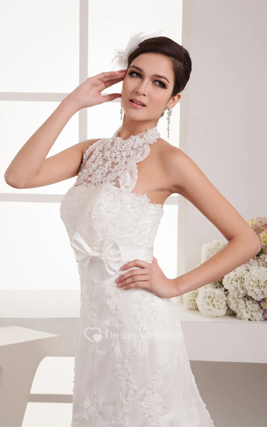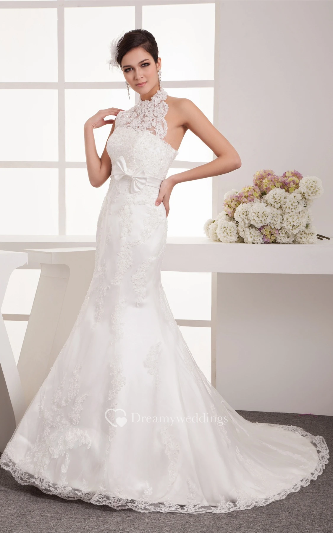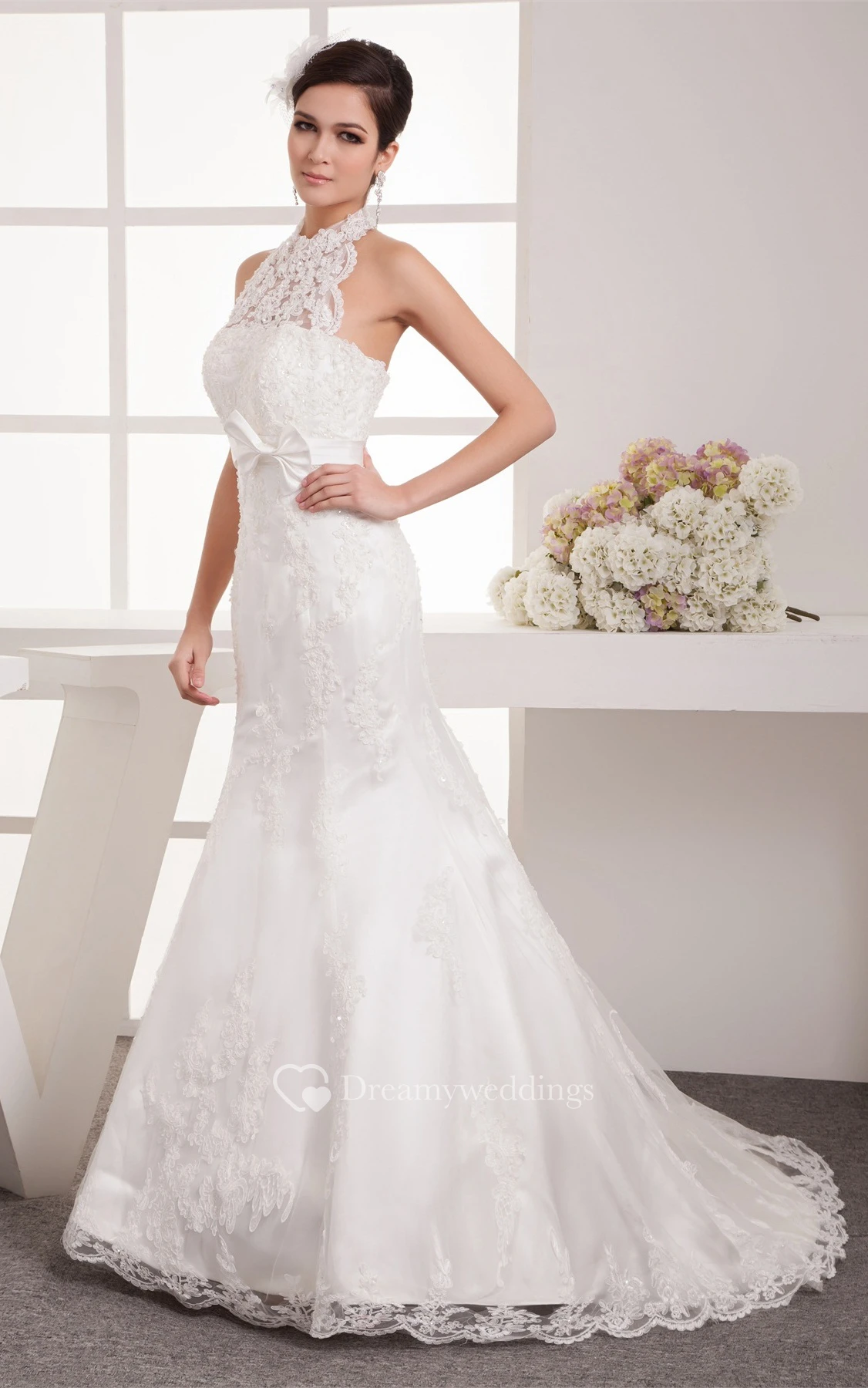 High-Neck Sleeveless Floor-Length Lace Sweep Train and Dress With Bow