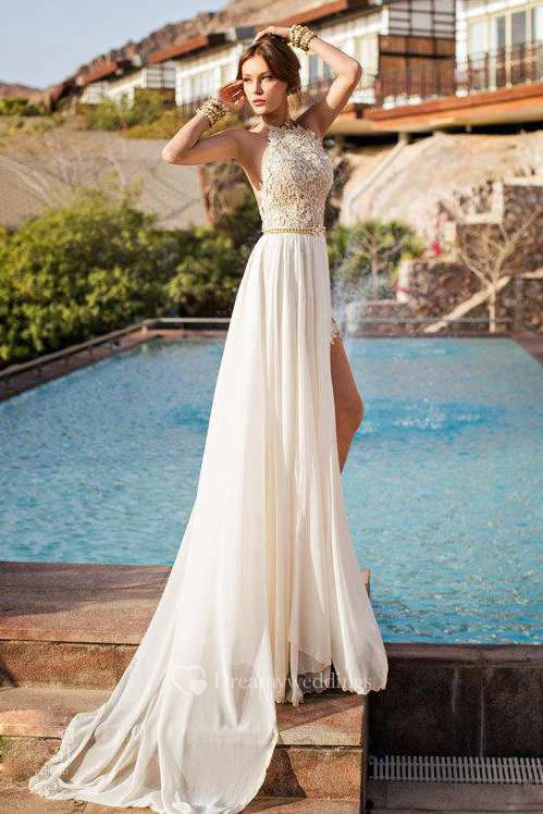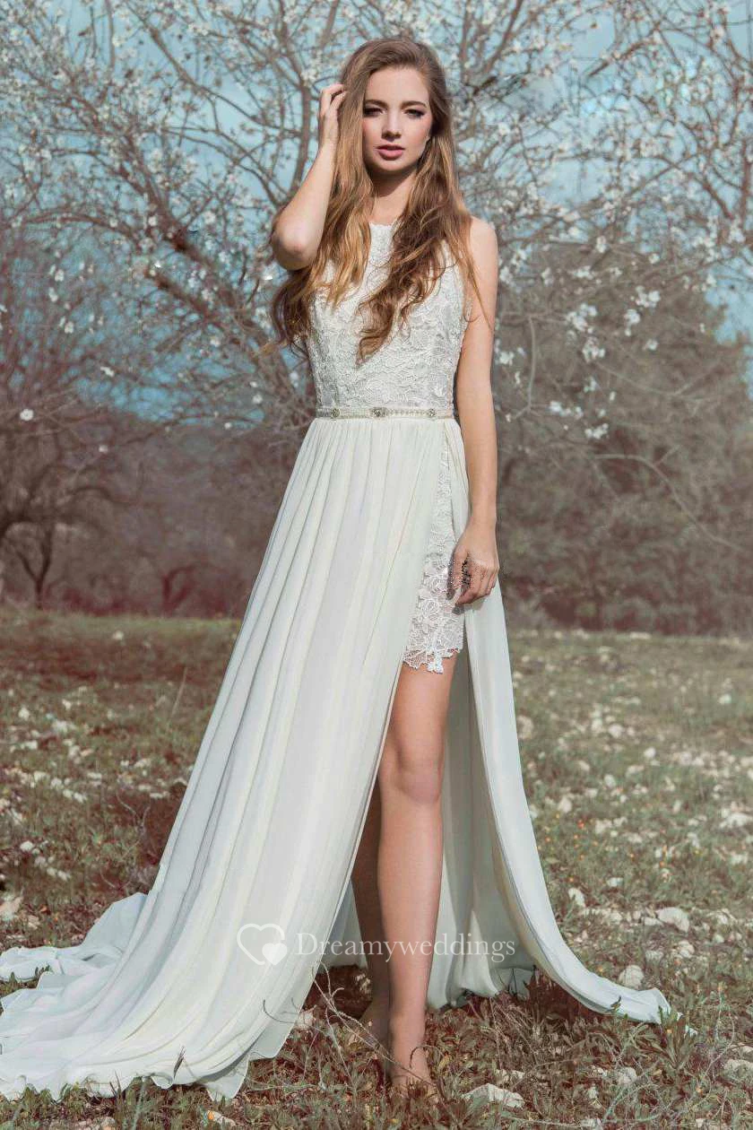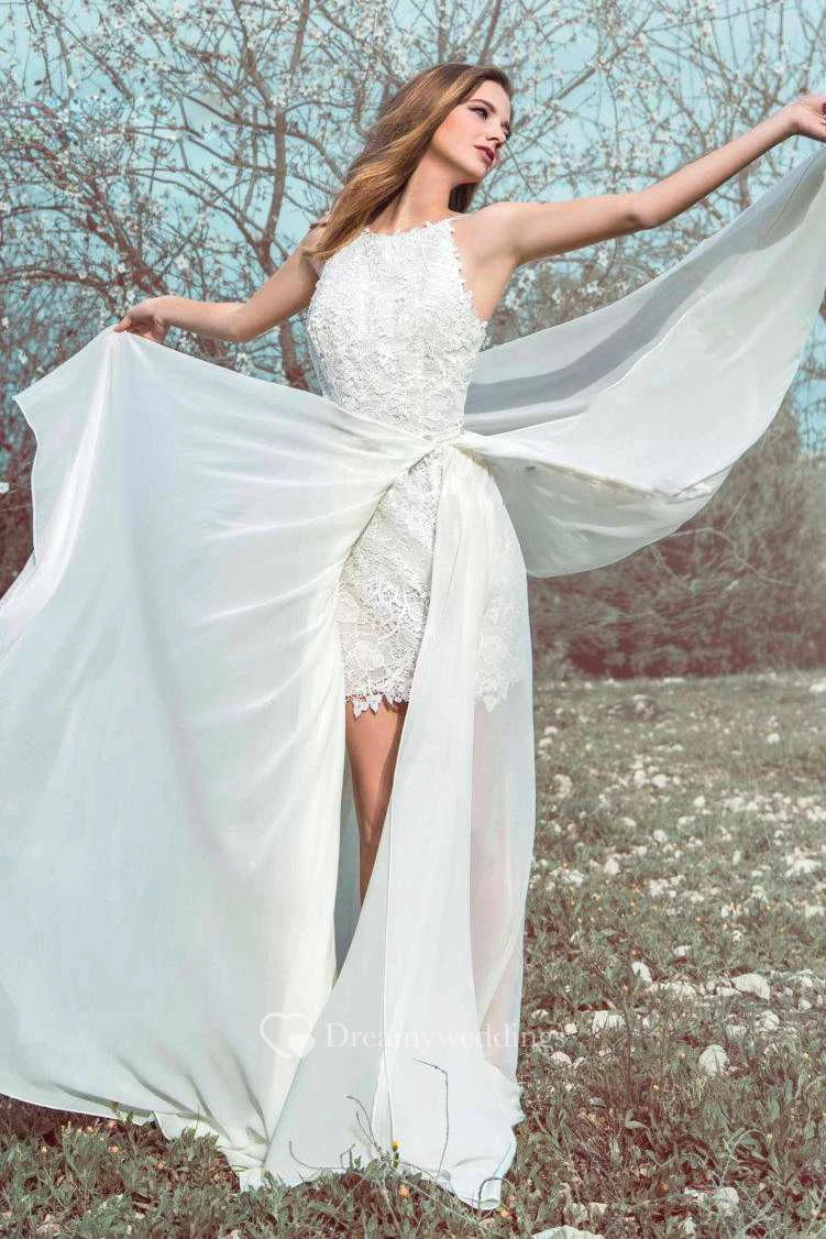 High Neck Sleeveless Lace Wedding Dress With Chiffon Skirt