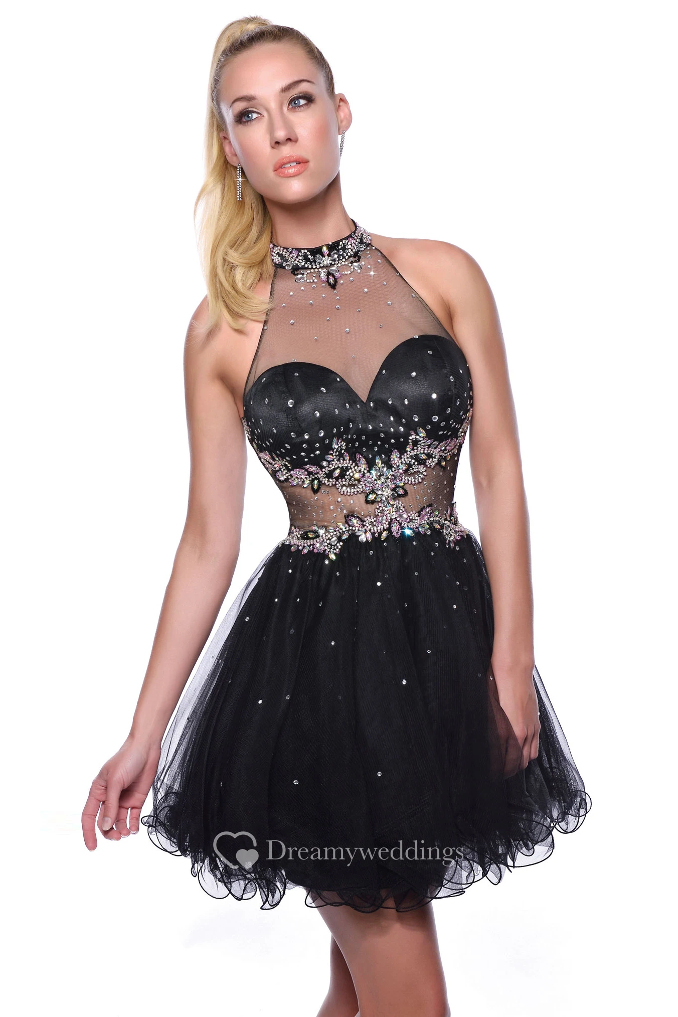 High Neck Sleeveless Short Tulle Homecoming Dress With Crystal Detailing