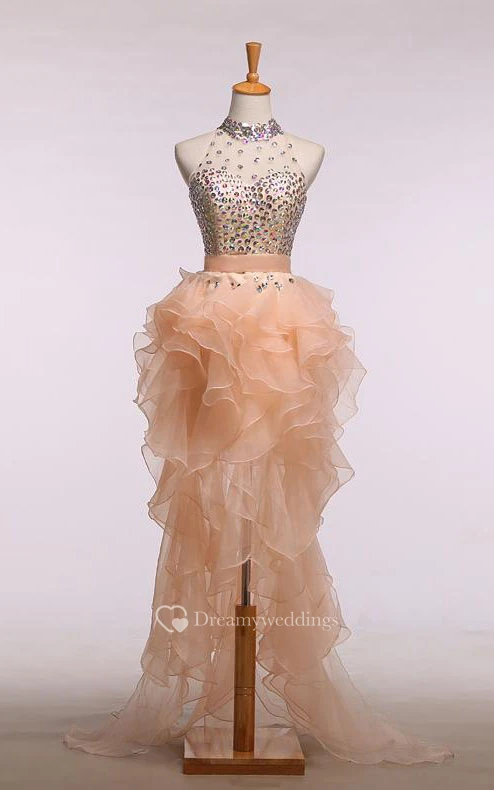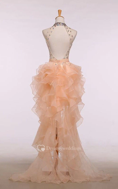 High Neck Sleevelss Beading Ruffled High-low A-line Dress