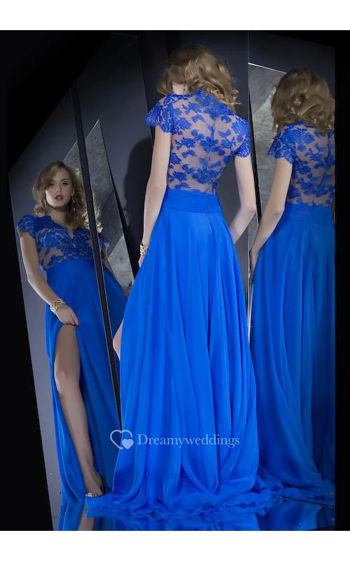 Hot Sale Long Lace Royal Blue Prom Dresses Slit Front Short Sleeves Evening Gown