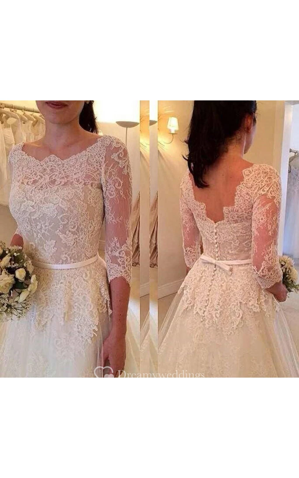 Illusion 3-4 Sleeves A-line Tulle Gown With Lace Bodice and Sash