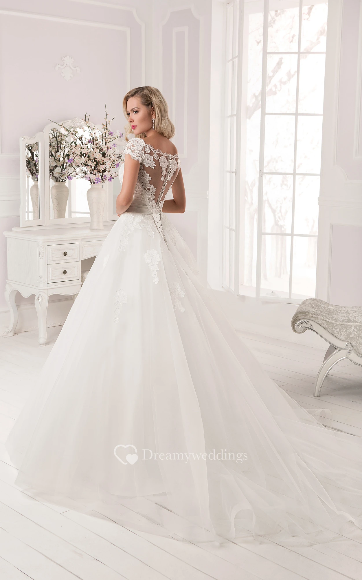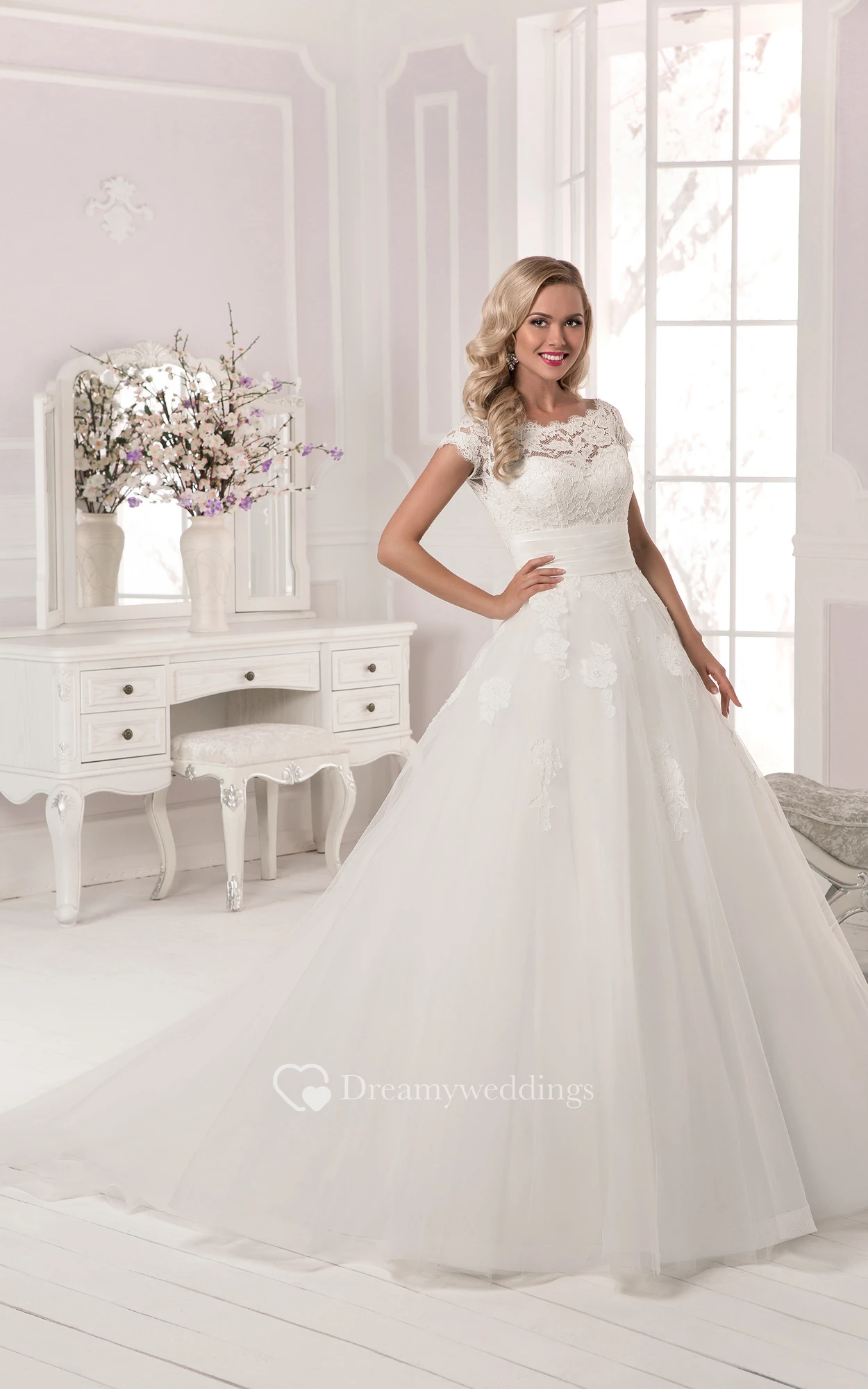 Illusion Back Short Sleeve Lace Top Applique Long Dress