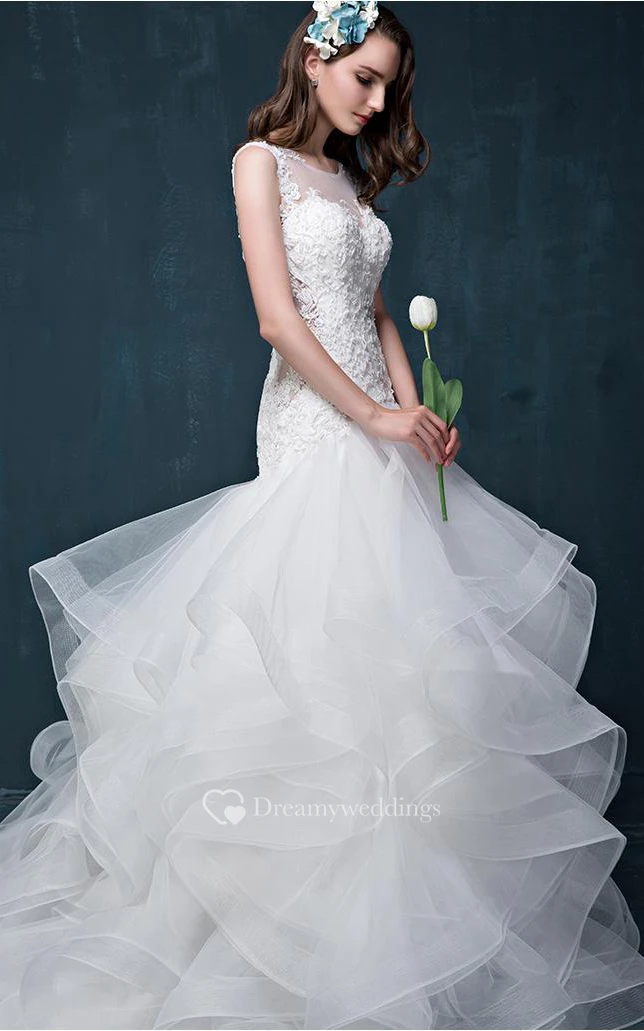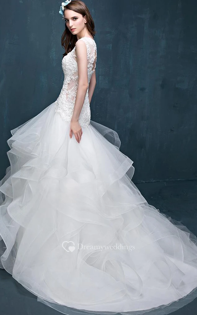 Illusion Beading Appliques Flower Ruffles Illusion Flower Illusion Lace-Up Back Keyhole Tulle Lace Organza Satin Dress
